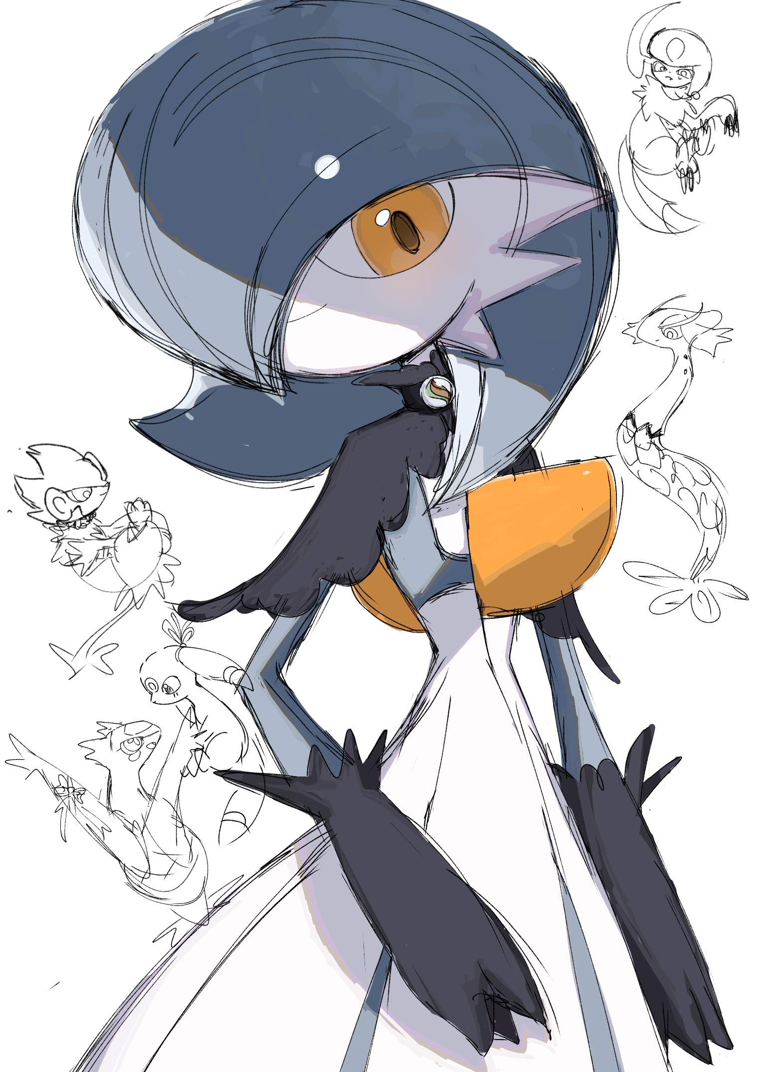 1girl absol alternate_color arm_at_side black_capelet black_gloves blue_hair blue_skin bob_cut capelet closed_mouth clothed_pokemon colored_skin doodle_inset female_focus flat_chest gardevoir gen_2_pokemon gen_3_pokemon gen_4_pokemon gloves hair_over_one_eye happy highres latias legendary_pokemon looking_afar luxray mega_stone milotic multicolored_skin nintendo one_eye_covered orange_eyes partially_colored pokemon pokemon_(creature) shicha_(yagu) shiny_pokemon short_hair sketch smile solo_focus two-tone_skin umbreon white_background white_skin