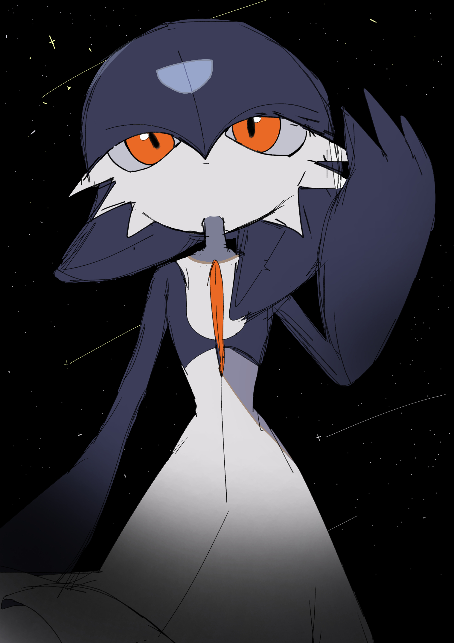 1girl alternate_color arm_at_side black_sky blue_hair blue_skin bob_cut closed_mouth colored_skin expressionless female_focus flat_chest gardevoir gen_3_pokemon hair_between_eyes hand_up highres looking_afar medium_hair multicolored_skin night nintendo outdoors pokemon pokemon_(creature) red_eyes shicha_(yagu) shiny_pokemon shooting_star sketch sky solo star_(sky) straight-on two-tone_skin white_skin
