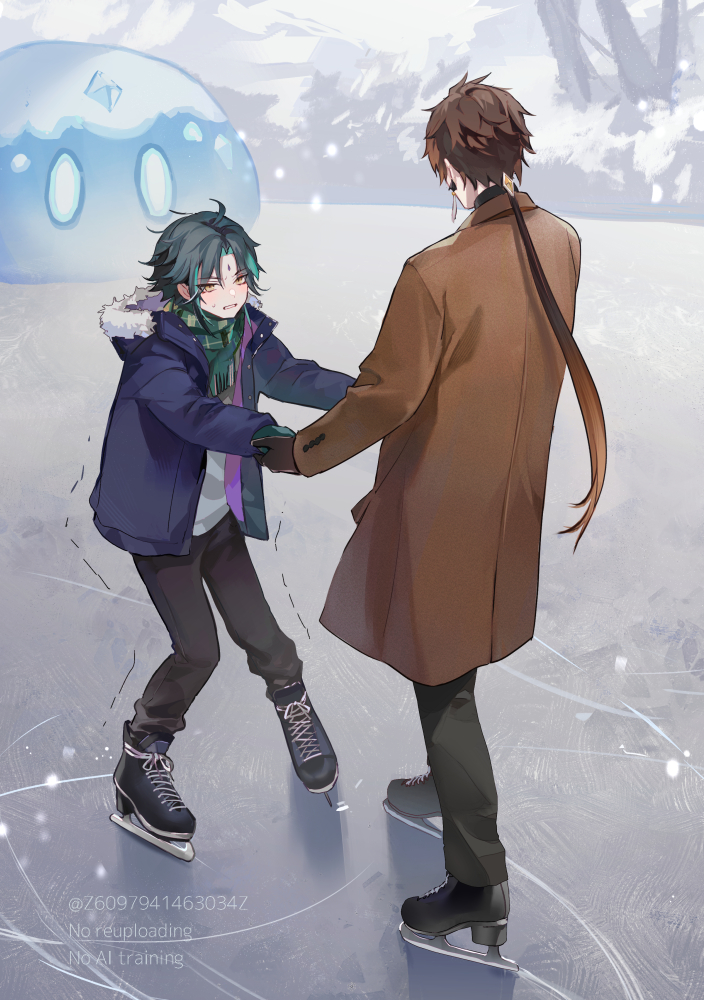 2boys aqua_hair black_footwear black_hair black_jacket black_pants brown_gloves brown_hair brown_jacket cryo_slime_(genshin_impact) earrings facial_mark forehead_mark fur-trimmed_jacket fur_trim genshin_impact gloves green_gloves green_scarf hair_between_eyes hair_ornament ice_skates ice_skating jacket jewelry long_hair long_sleeves male_focus multicolored_hair multiple_boys pants ponytail scarf shirt shoes short_hair single_earring skates skating slime_(genshin_impact) sneakers snow tassel tassel_earrings white_shirt xiao_(genshin_impact) yellow_eyes z6097941463034z zhongli_(genshin_impact)