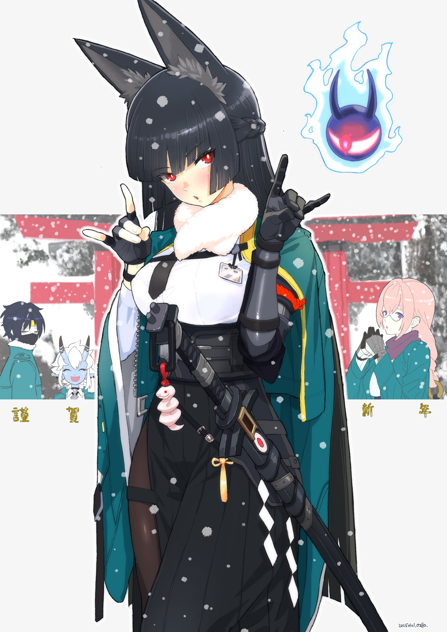 1boy 3girls animal_ears asaba_harumasa black_gloves black_hair black_necktie black_pantyhose black_skirt blue_skin blunt_bangs blush closed_eyes closed_mouth colored_skin dress_shirt fingerless_gloves fox_ears fox_girl gauntlets glasses gloves green_jacket headband high-waist_skirt highres horns hoshimi_miyabi jacket long_hair looking_at_viewer mazarimon multiple_girls necktie oni pantyhose pink_eyes pink_hair ring_hair_ornament shirt short_hair sidelocks single_fingerless_glove skirt snow soukaku_(zenless_zone_zero) tailless_(zenless_zone_zero) tsukishiro_yanagi white_hair white_shirt yellow_eyes yellow_headband zenless_zone_zero