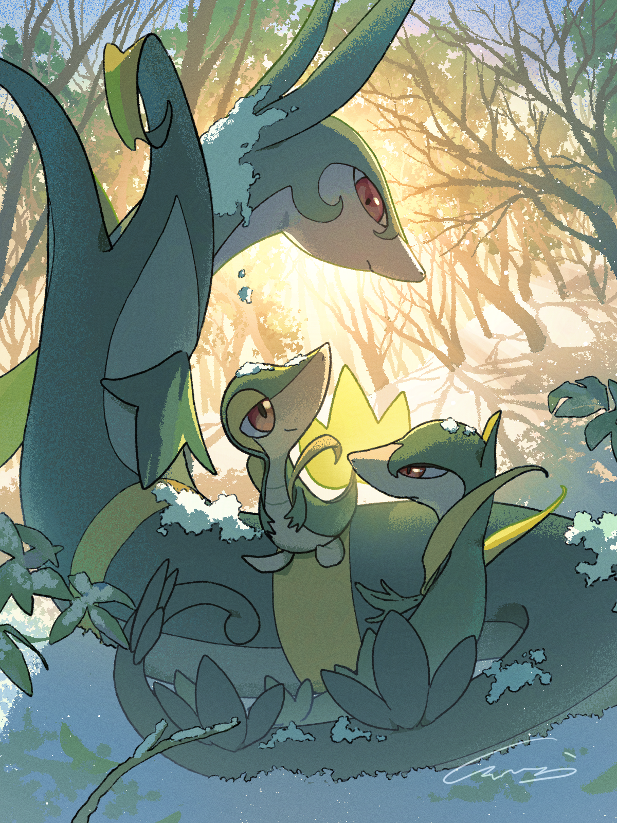 animal_focus bare_tree closed_mouth commentary_request day evolutionary_line gen_5_pokemon highres houkou_illust nintendo no_humans outdoors pokemon pokemon_(creature) serperior servine snake snivy snow sunset tree winter