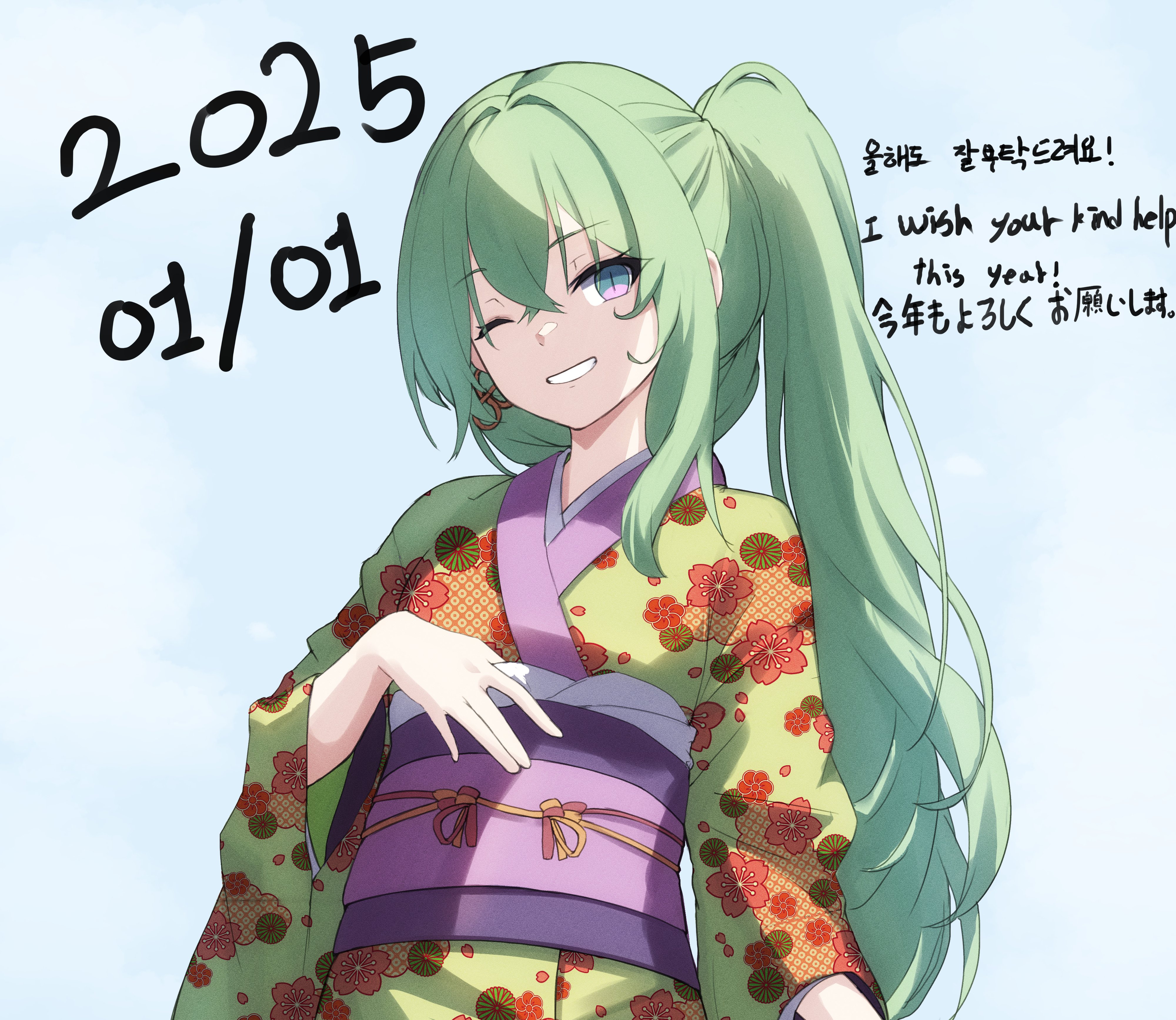 1girl absurdres alternate_costume blue_background commentary_request cream_bread dated dated_commentary english_text floral_print floral_print_kimono green_kimono highres honkai_(series) honkai_impact_3rd japanese_clothes kimono korean_commentary korean_text long_hair mobius_(honkai_impact) one_eye_closed ponytail print_kimono slit_pupils smile solo translation_request upper_body