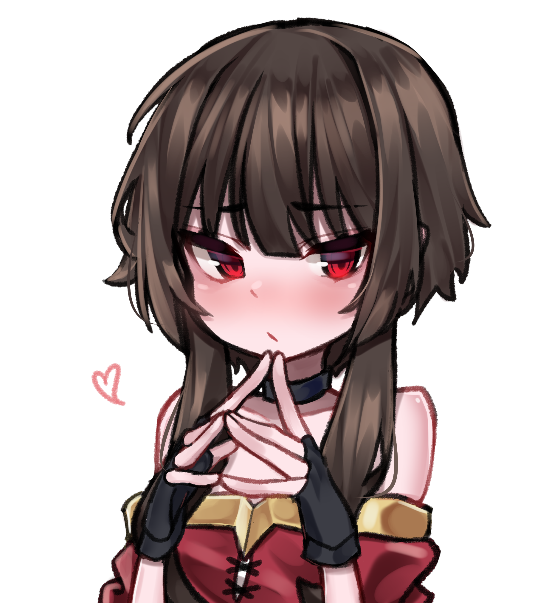 1girl bare_shoulders black_choker black_gloves blush brown_hair child choker closed_mouth collarbone dot_mouth dot_nose dress embarrassed eyebrows female_focus fingerless_gloves gloves hands_up highres kono_subarashii_sekai_ni_shukufuku_wo! looking_at_viewer megumin myanja off-shoulder_dress off_shoulder own_fingers_together red_dress red_eyes short_hair_with_long_locks simple_background solo two-tone_dress upper_body white_background yellow_dress
