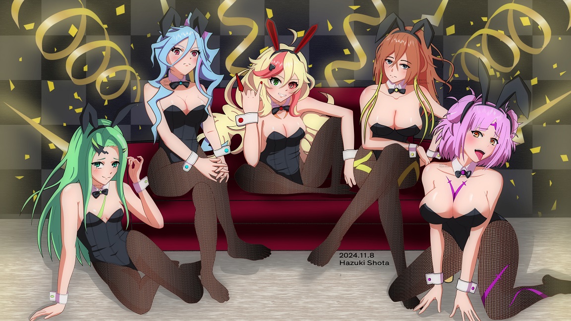 5girls animal_ears bare_shoulders black_leotard blonde_hair blue_eyes blue_hair bow bowtie breasts brown_hair couch detached_collar double_bun fake_animal_ears green_eyes green_hair hair_behind_ear hair_between_eyes hair_bun hair_ornament hazuki_shouta heart heterochromia horns large_breasts leotard long_hair looking_at_viewer macross macross_delta macross_delta:_zettai_live!!!!!! multicolored_hair multiple_girls on_couch open_mouth pink_hair playboy_bunny ponytail purple_hair rabbit_ears red_eyes red_hair side_ponytail single_horn sitting smile strapless strapless_leotard streaked_hair tongue tongue_out very_long_hair wrist_cuffs yami_freyja yami_kaname yami_makina yami_q_ray yami_reina yamikumo
