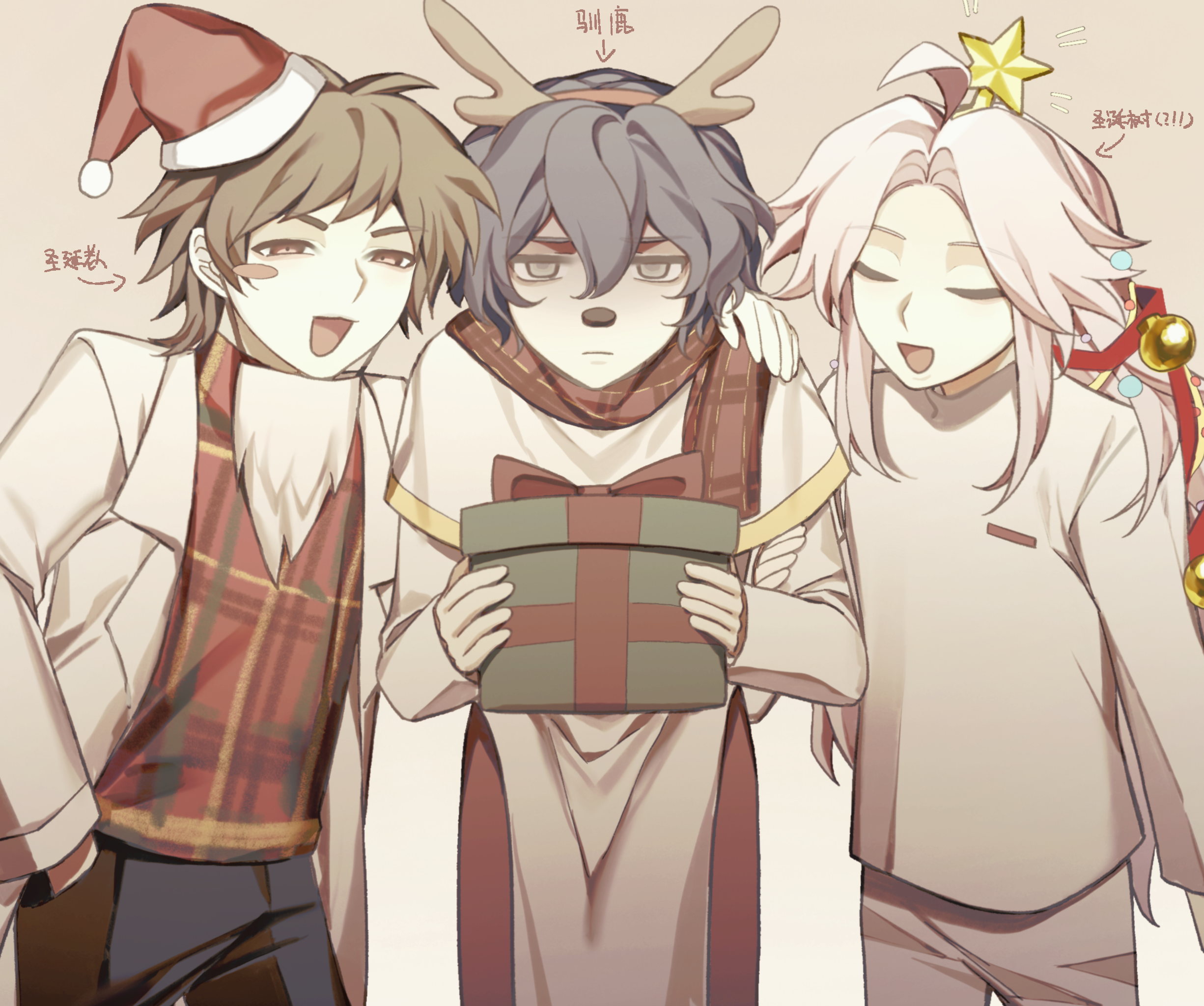 3boys arrow_(symbol) black_hair black_pants blush_stickers box brown_hair capelet chinese_commentary chinese_text chunaizhanshi23057 closed_eyes closed_mouth commentary_request curtained_hair fake_antlers fake_nose gift gift_box gold_trim gradient_background grey_eyes hair_between_eyes hair_ornament hand_in_pocket hand_on_another's_shoulder harada_minoru hat hatsutori_hajime highres holding holding_gift lab_coat long_hair long_sleeves male_focus multiple_boys open_clothes open_mouth pants parted_bangs pink_hair plaid_clothes plaid_scarf plaid_vest red_hat red_pants red_scarf red_vest saibou_shinkyoku santa_hat scarf shirt short_hair sidelocks simple_background single_blush_sticker smile star_(symbol) star_hair_ornament translation_request utsugi_noriyuki v-shaped_eyebrows variant_set vest white_capelet white_pants white_shirt