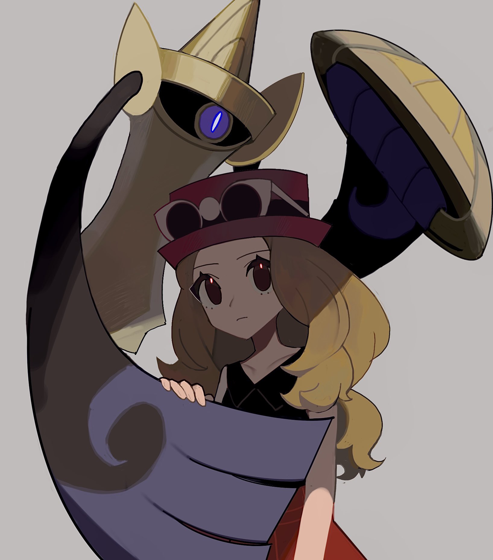 1girl 950magi618 aegislash black_shirt blonde_hair closed_mouth eyewear_on_headwear gen_6_pokemon hat highres long_hair looking_at_viewer nintendo pokemon pokemon_(creature) pokemon_x_and_y red_hat red_skirt serena_(pokemon) shirt skirt sleeveless sleeveless_shirt sunglasses