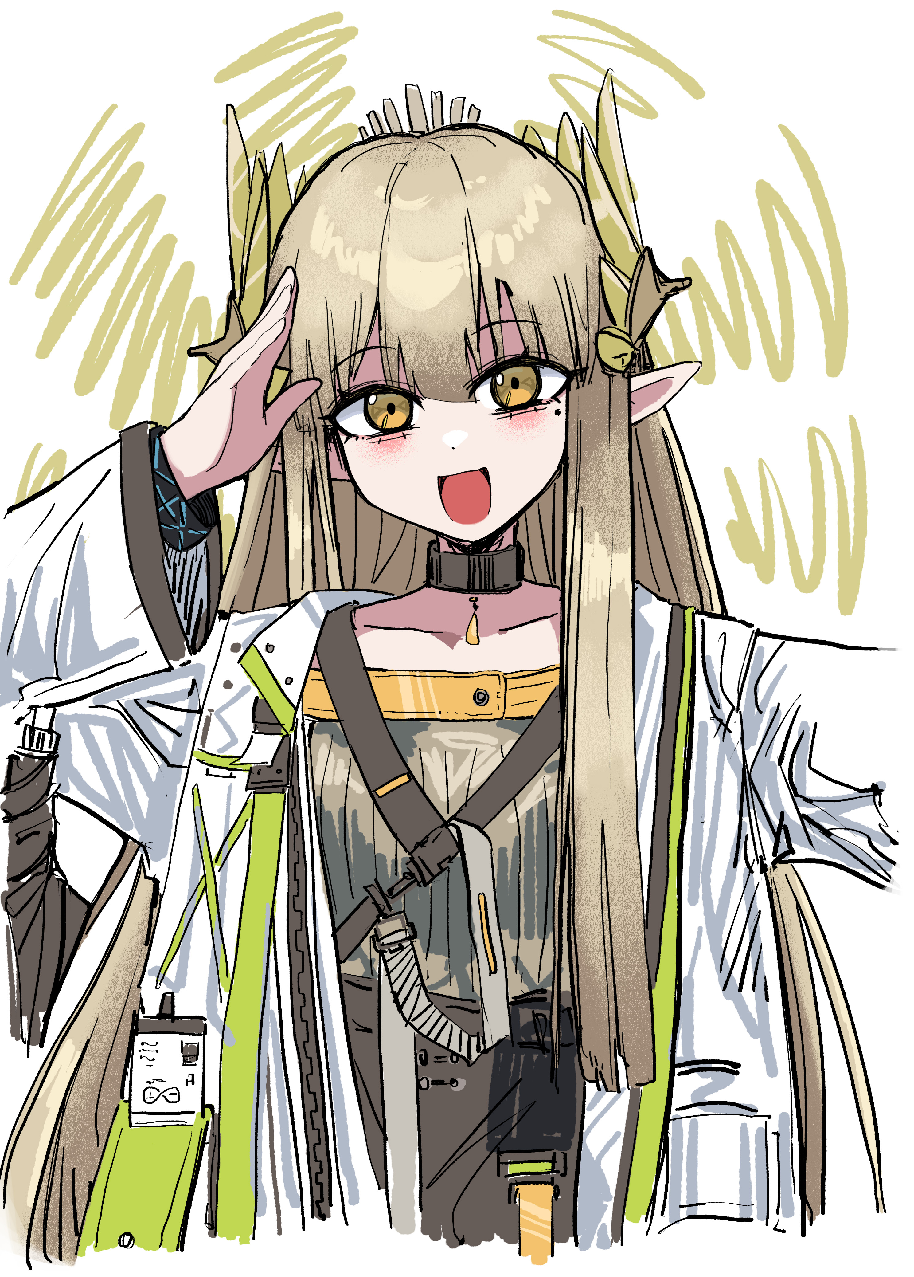 1girl :d absurdres arknights black_choker blonde_hair choker coat elf hair_ornament hand_up highres id_card infection_monitor_(arknights) koshou_shou_mitsu laurel_crown long_hair long_sleeves looking_at_viewer mole mole_under_eye muelsyse_(arknights) open_clothes open_coat open_mouth pendant_choker pointy_ears salute sidelocks smile solo upper_body white_background white_coat yellow_eyes