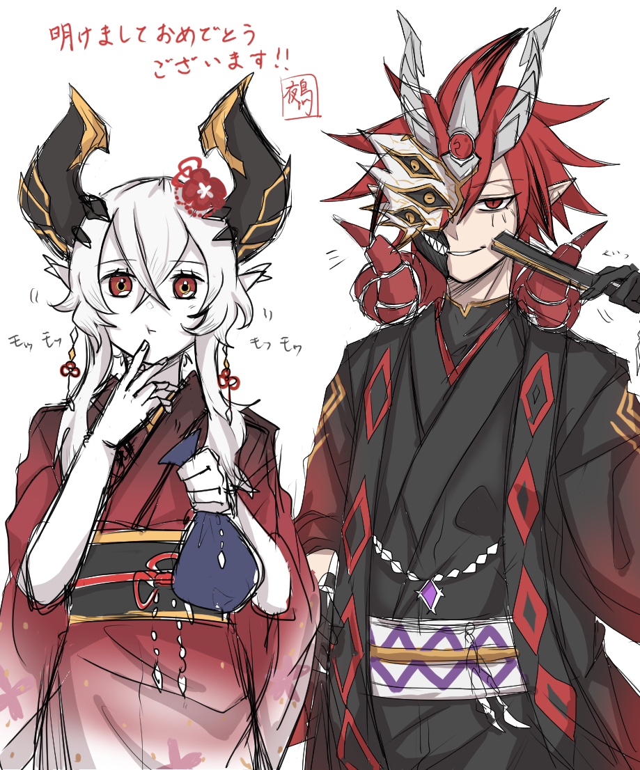 1boy 1girl alternate_costume aluber_(yu-gi-oh!) aluber_the_jester_of_despia black_gloves black_sclera blazing_cartesia_the_virtuous colored_sclera demon_boy demon_girl ecclesia_(yu-gi-oh!) evil_grin evil_smile extra_eyes flower food_in_mouth gloves grin hair_flower hair_ornament half_mask hand_fan japanese_clothes jewelry kimono kinchaku long_hair mark_under_eye mask obi obijime pale_skin paper_fan pointy_ears pouch red_eyes red_hair sash smile translation_request upper_body white_hair wide_sleeves yellow_pupils yoruno_tori3 yu-gi-oh! yu-gi-oh!_master_duel