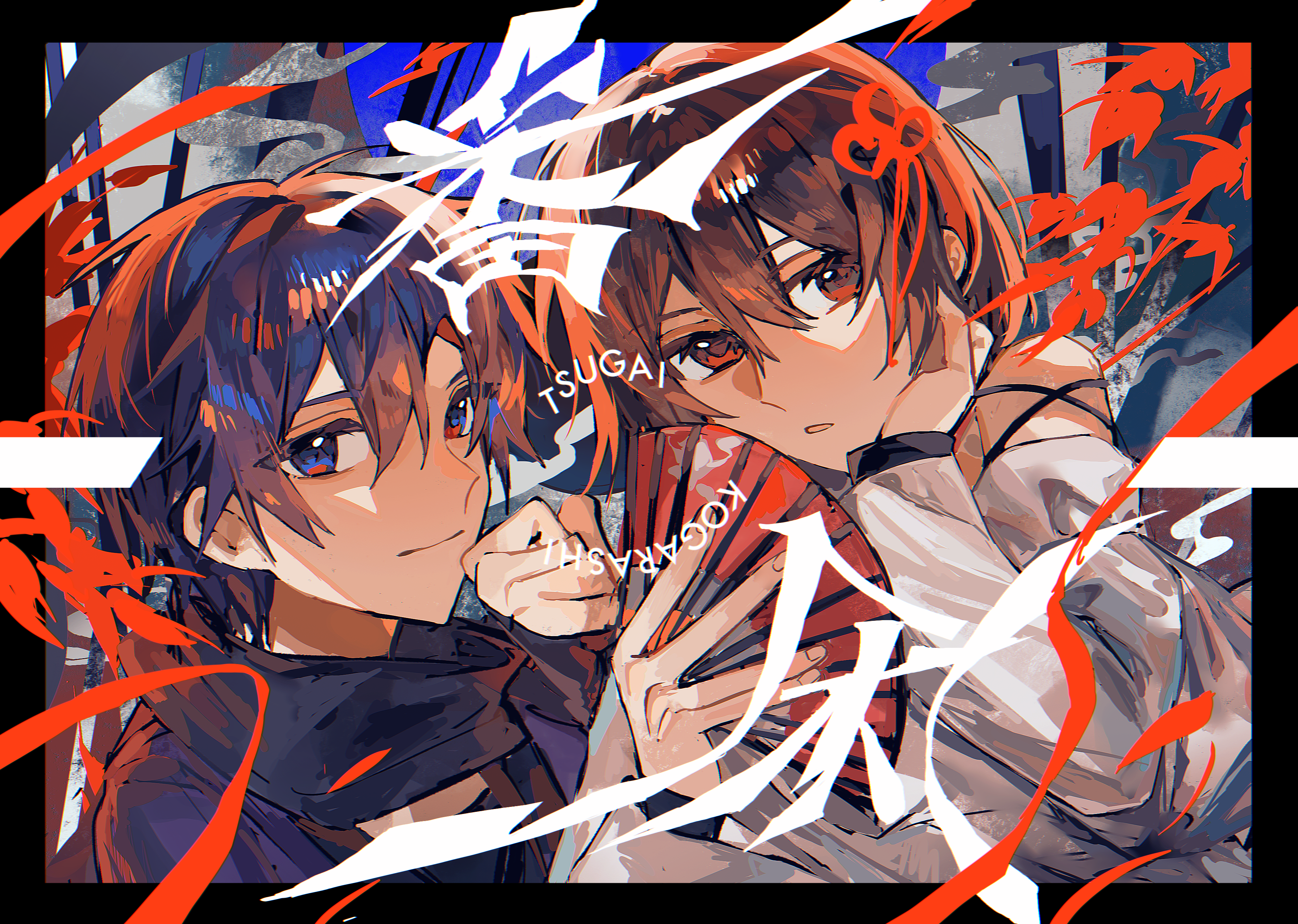 1boy 1girl absurdres black_border blue_eyes blue_hair blue_scarf border brown_eyes brown_hair colored_eyelashes commentary_request double-parted_bangs kaito_(drizzle)_(vocaloid) hair_between_eyes hair_ornament hand_fan hand_on_own_cheek hand_on_own_face highres holding holding_fan kaito_(vocaloid) looking_at_viewer looking_to_the_side meiko_(vocaloid) meiko_(momiji)_(vocaloid) nidu_(2du_du) open_mouth project_diva_(series) romaji_text scarf short_hair song_name tsugai_kogarashi_(vocaloid) upper_body vocaloid
