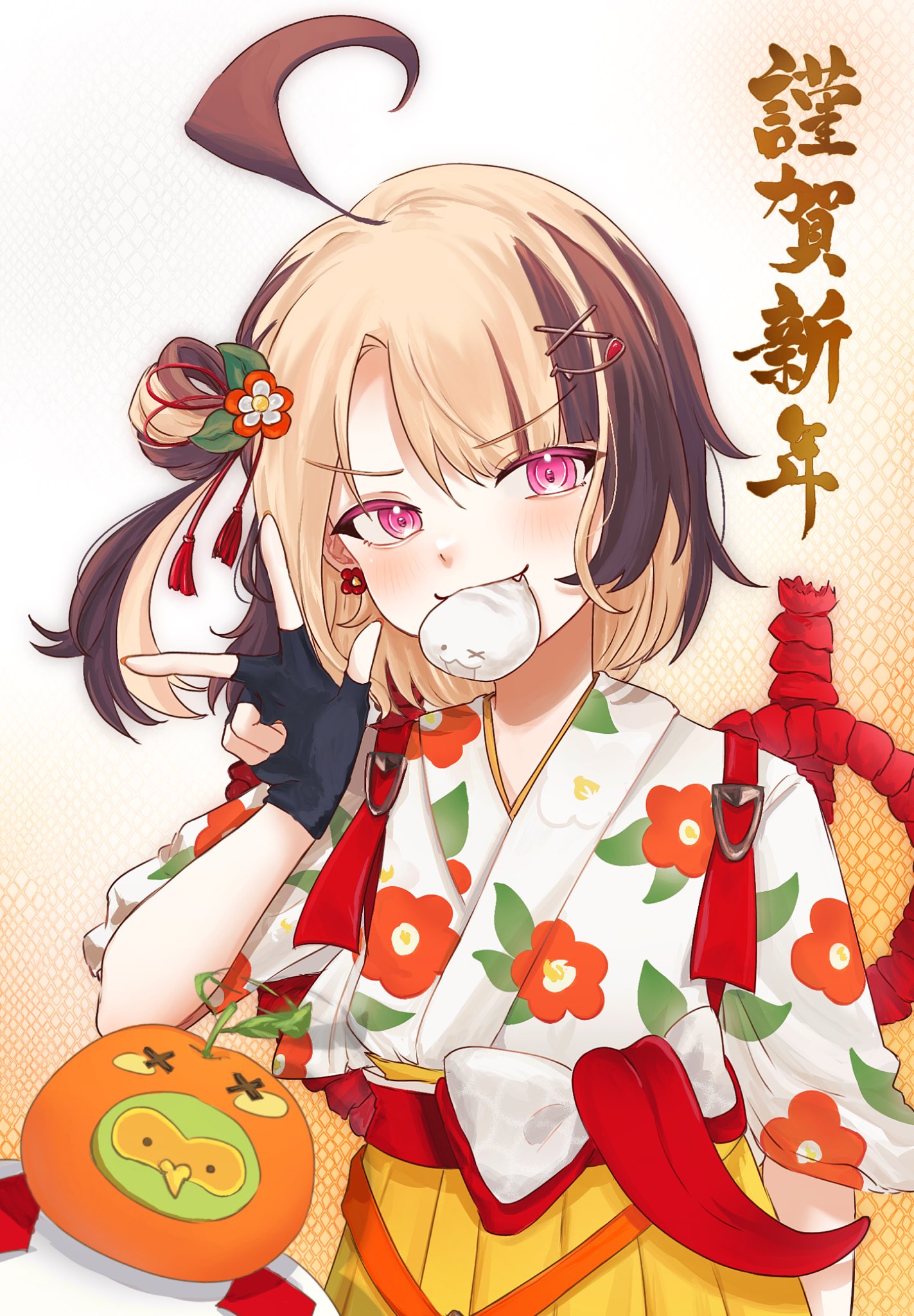ahoge black_gloves blonde_hair brown_hair commentary earrings english_commentary fang fingerless_gloves floral_print floral_print_kimono flower_earrings gigi_murin gigi_murin_(new_year) gloves grem_(gigi_murin) hair_ornament hair_rings hairclip hakama hakama_skirt happy_(yppah1060) highres hololive hololive_english huge_ahoge japanese_clothes jewelry kanzashi kimono looking_at_viewer mouth_hold multicolored_hair obi official_alternate_costume official_alternate_hairstyle one_side_up pink_eyes popo_(gigi_murin) print_kimono red_rope red_sash rope sash shimenawa short_hair single_hair_ring skirt solo streaked_hair tassel tassel_hair_ornament tasuki translation_request tsumami_kanzashi two-tone_hair upper_body virtual_youtuber white_kimono x_hair_ornament yellow_skirt