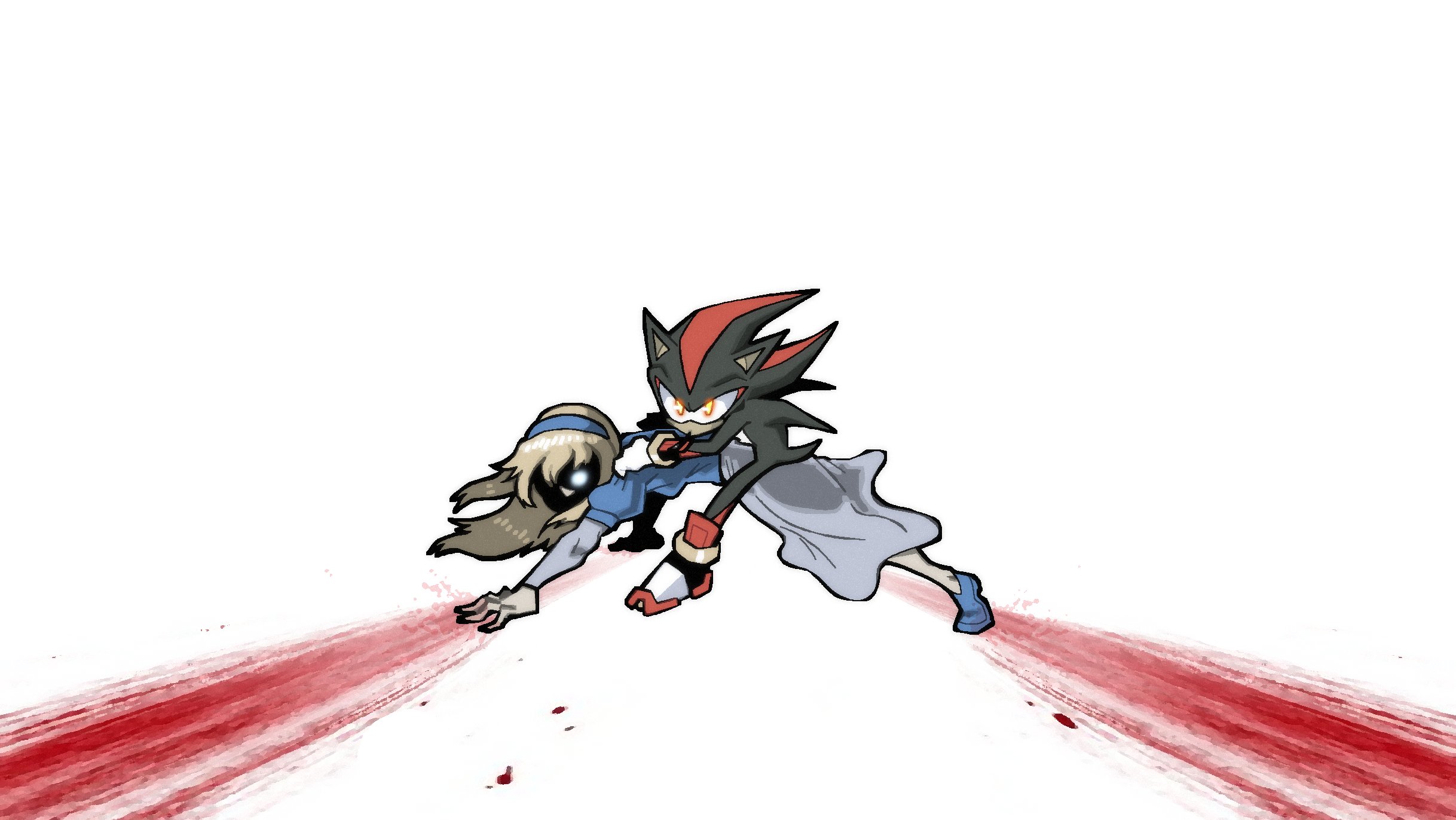 1boy 1girl akira_(manga) akira_slide black_fur blank_eyes blonde_hair blood blood_on_ground blue_dress blue_footwear blue_hairband ceddrawsnear dress glowing glowing_eyes hairband highres hunched_over inhibitor_rings jewelry long_sleeves maria_robotnik on_person parody puffy_short_sleeves puffy_sleeves red_streaks ring shaded_face shadow_the_hedgehog shoes short_sleeves sitting sitting_on_person sneakers sonic_(series) streaked_hair striped_fur what yellow_eyes