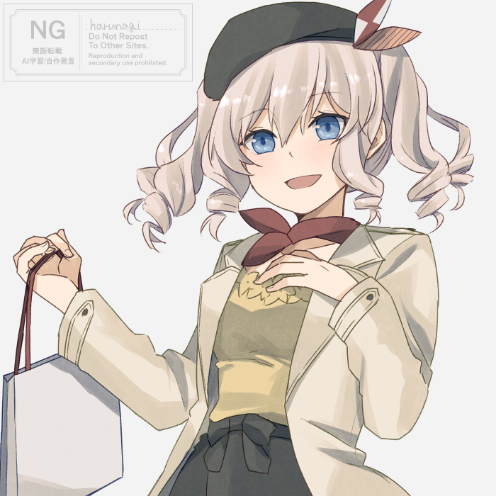 1girl bag beret black_hat black_skirt blue_eyes grey_background grey_hair harunagi_(amairo345) hat holding holding_bag jacket kantai_collection kashima_(kancolle) kashima_(mitsukoshi)_(kancolle) long_hair looking_at_viewer official_alternate_costume one-hour_drawing_challenge red_scarf scarf shirt shopping_bag simple_background skirt smile solo twintails watermark wavy_hair white_jacket yellow_shirt