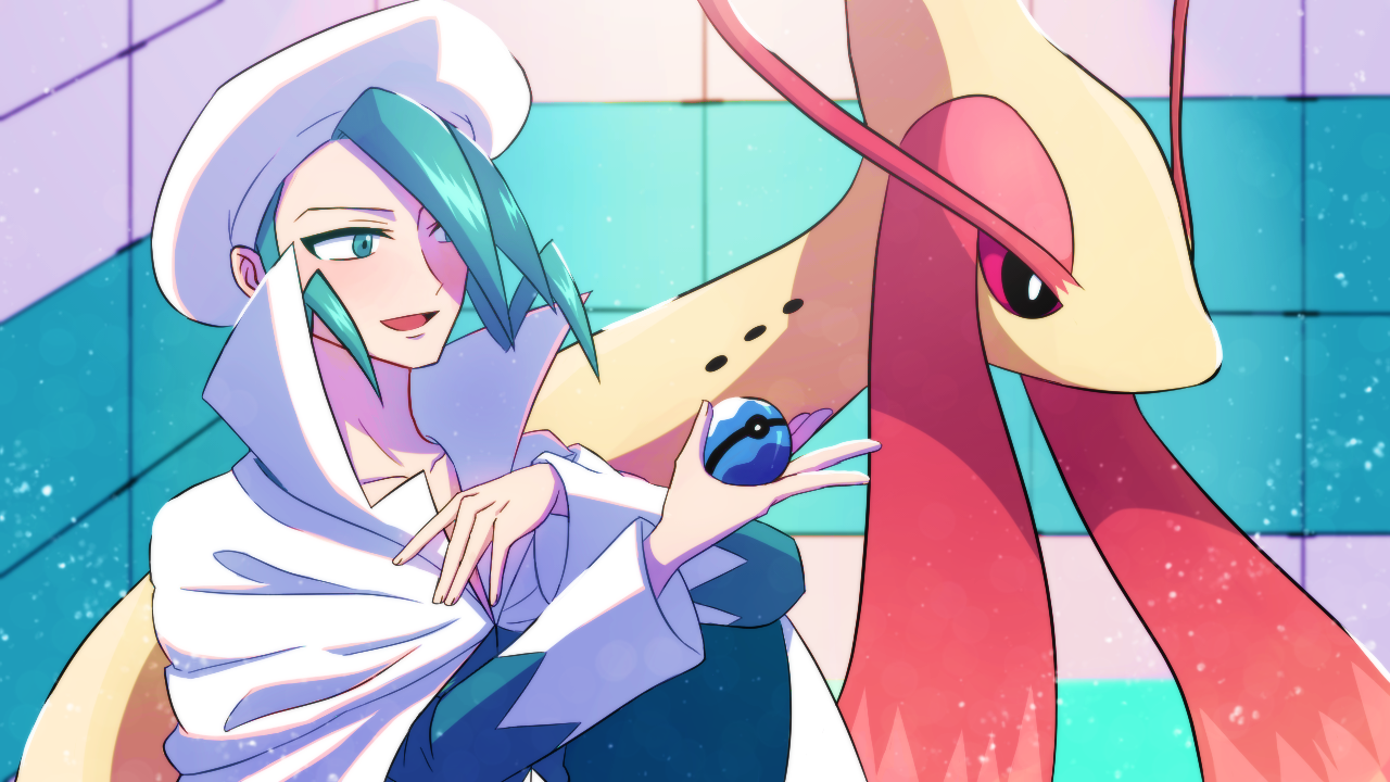 1boy :d cape commentary_request dive_ball gen_3_pokemon green_eyes green_hair hands_up haruki_sparsa hat holding holding_poke_ball indoors long_sleeves male_focus milotic nintendo open_mouth poke_ball pokemon pokemon_(creature) pokemon_emerald pokemon_ruby/sapphire/emerald popped_collar shirt short_hair smile tile_wall tiles tongue wallace_(pokemon) white_cape white_hat