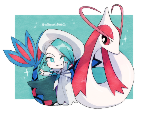 1boy beret border bright_pupils character_name chibi cloak closed_mouth commentary_request gen_3_pokemon green_background green_eyes green_hair haruki_sparsa hat long_sleeves looking_to_the_side male_focus milotic nintendo outstretched_arm pants pokemon pokemon_(creature) pokemon_emerald pokemon_ruby/sapphire/emerald purple_pants shirt shoes short_hair smile sparkle standing wallace_(pokemon) white_border white_cloak white_hat white_pupils