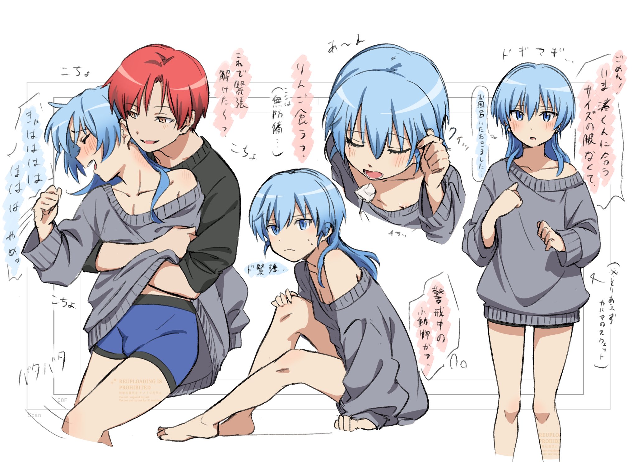 2boys akabane_karma androgynous ansatsu_kyoushitsu black_sweater blue_eyes blue_hair blue_male_underwear blush eating grey_sweater hair_between_eyes highres legs long_hair looking_at_viewer male_underwear multiple_boys orange_eyes oversized_clothes pizarrokun red_hair shiota_nagisa short_hair sidelocks speech_bubble sweater tickling trap underwear white_background