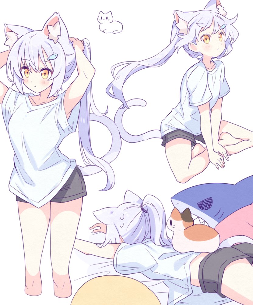 1girl animal_ear_fluff animal_ears animalization black_shorts cat cat_ears cat_girl cat_tail cropped_legs fish_hair_ornament hair_ornament indian_style long_hair lying multiple_views on_stomach original person_and_animalization ponytail shirt short_shorts short_sleeves shorts simple_background sitting stuffed_animal stuffed_shark stuffed_toy suzuno_(suzuno3110) tail tying_hair very_long_hair white_background white_hair white_shirt yellow_eyes