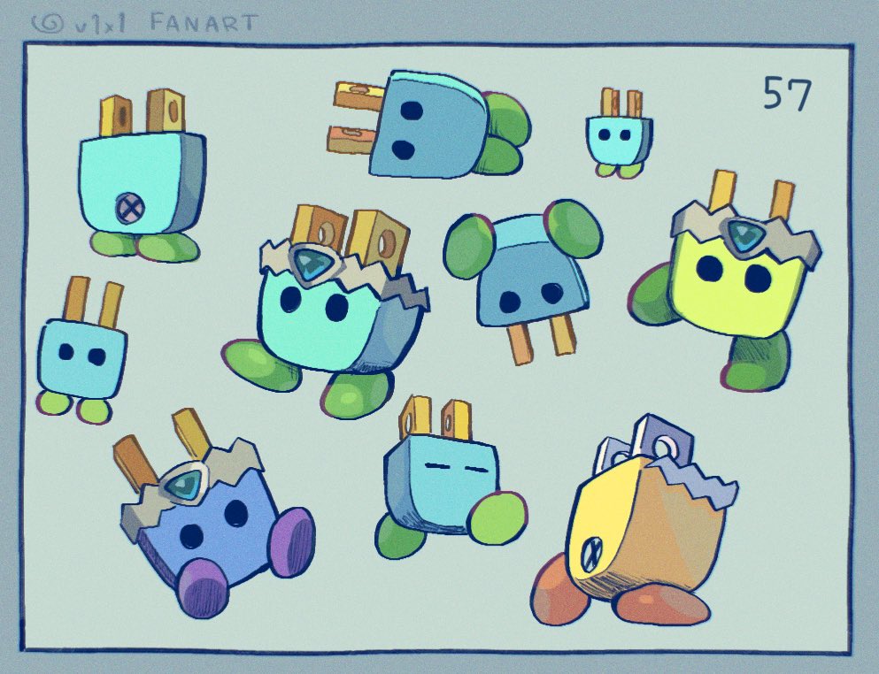 alternate_color blue_border border closed_eyes electric_plug english_text from_behind full_body grey_background kirby_star_allies kirby_(series) lying multiple_views nintendo no_humans no_mouth official_alternate_color on_side plugg_(kirby) screw simple_background standing standing_on_one_leg suyasuyabi upside-down