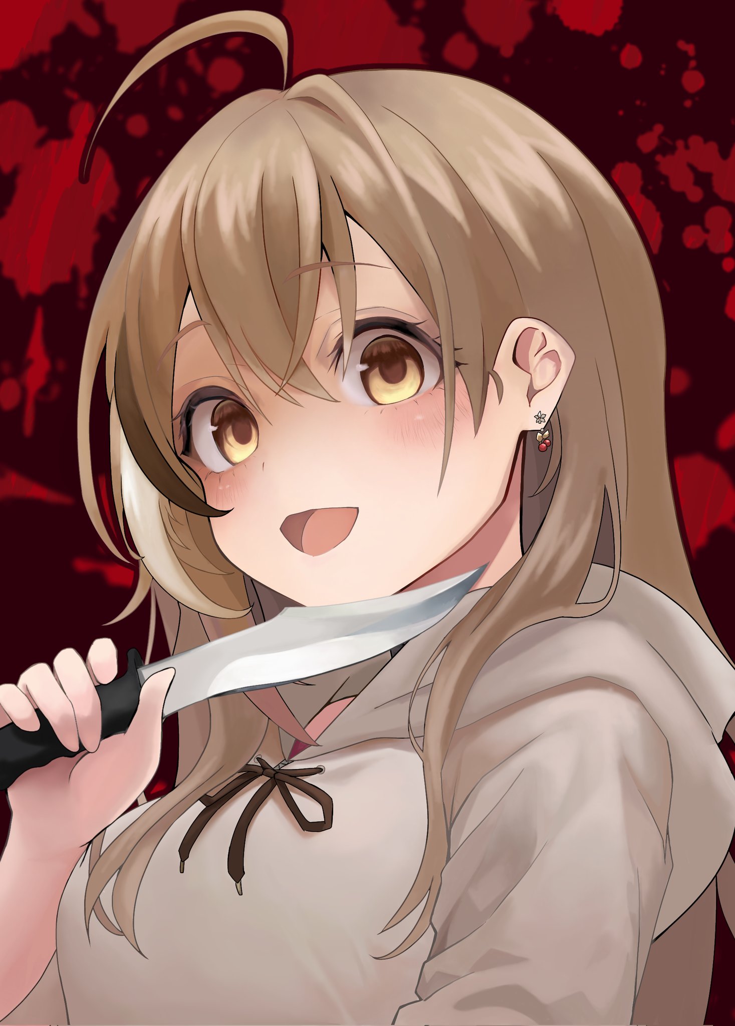 1girl :d ahoge berry blood blood_splatter brown_eyes brown_hair brown_hoodie commentary earrings food-themed_earrings highres holding holding_knife hololive hololive_english hood hoodie jewelry knife long_hair looking_at_viewer multicolored_hair nanashi_mumei nanashi_mumei_(casual) open_mouth portrait red_shirt shirt smile splatter_background streaked_hair virtual_youtuber vx60753069