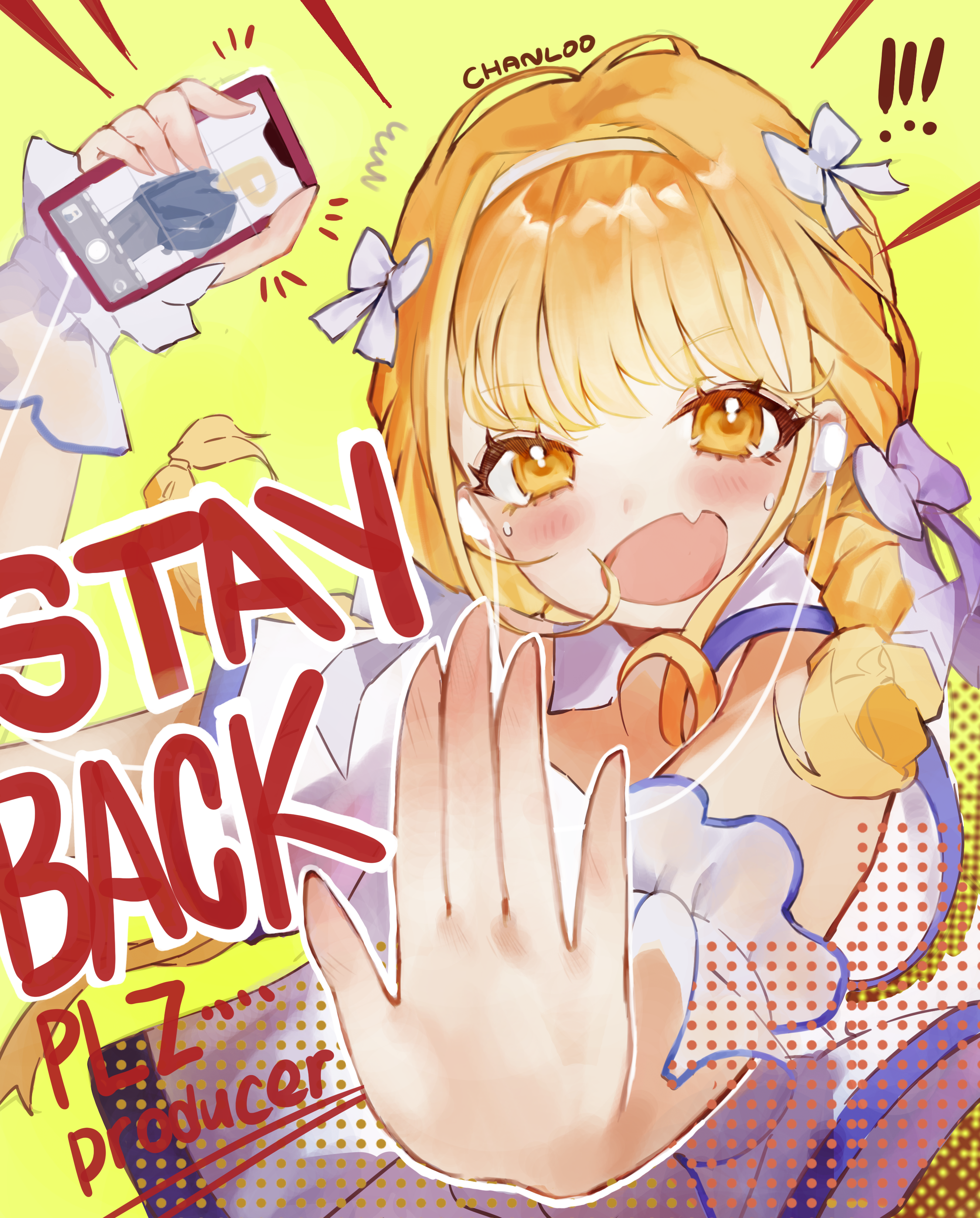 ! !! 1girl :o absurdres b2w blonde_hair blush bow braid cellphone cellphone_photo commentary fang fujita_kotone gakuen_idolmaster hair_bow highres holding holding_phone idolmaster p-head_producer phone producer_(idolmaster) skin_fang solo sweatdrop twin_braids upper_body white_bow yellow_background yellow_eyes