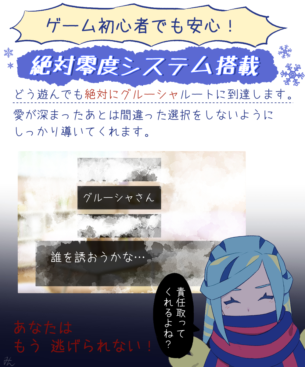 1boy aqua_hair blue_scarf character_name closed_eyes commentary_request dialogue_options eyelashes grusha_(pokemon) highres jacket male_focus medium_hair min_(myna8247) nintendo pokemon pokemon_scarlet_and_violet scarf scarf_over_mouth signature snowflakes solo speech_bubble striped_clothes striped_scarf translation_request yellow_jacket