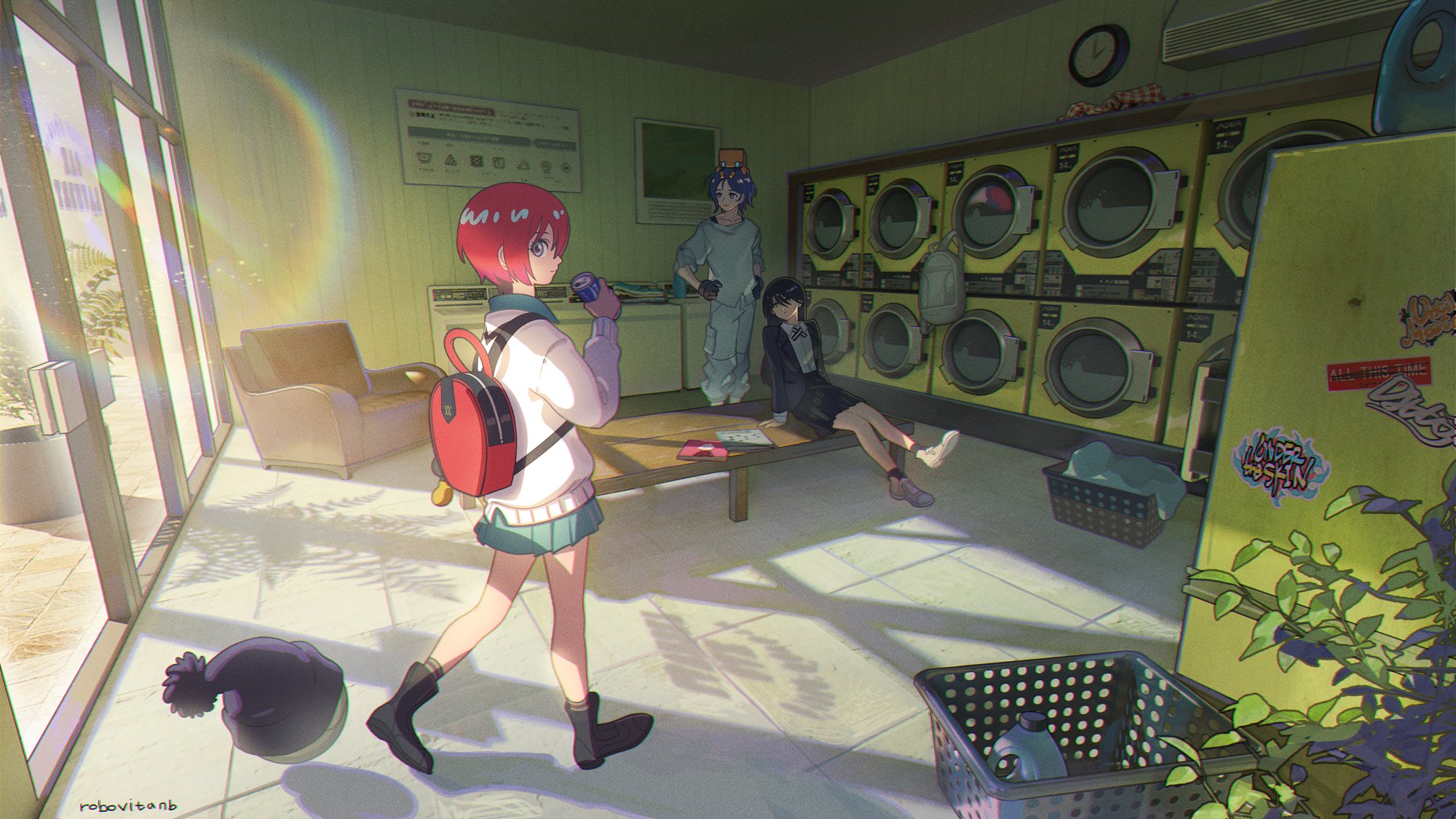 1boy 2girls amate_yuzuriha analog_clock artist_name backpack bag beanie black_boots black_gloves black_hair black_hat black_jacket black_skirt black_socks blue_eyes blue_hair blue_skirt boots can chair clock closed_mouth collared_shirt commentary_request door drink_can glass_door gloves gundam gundam_gquuuuuux hair_between_eyes hands_on_own_hips haro hat highres holding holding_can jacket laundromat laundry laundry_basket long_sleeves looking_to_the_side miniskirt multiple_girls nyaan_(gundam_gquuuuuux) open_clothes open_jacket pants red_bag red_eyes red_hair shadow shinwoo_choi shirt shoes short_hair shuji_ito sign sitting sitting_on_table skirt socks sweater table walking washing_machine white_bag white_footwear white_pants white_shirt white_sweater yellow_eyes