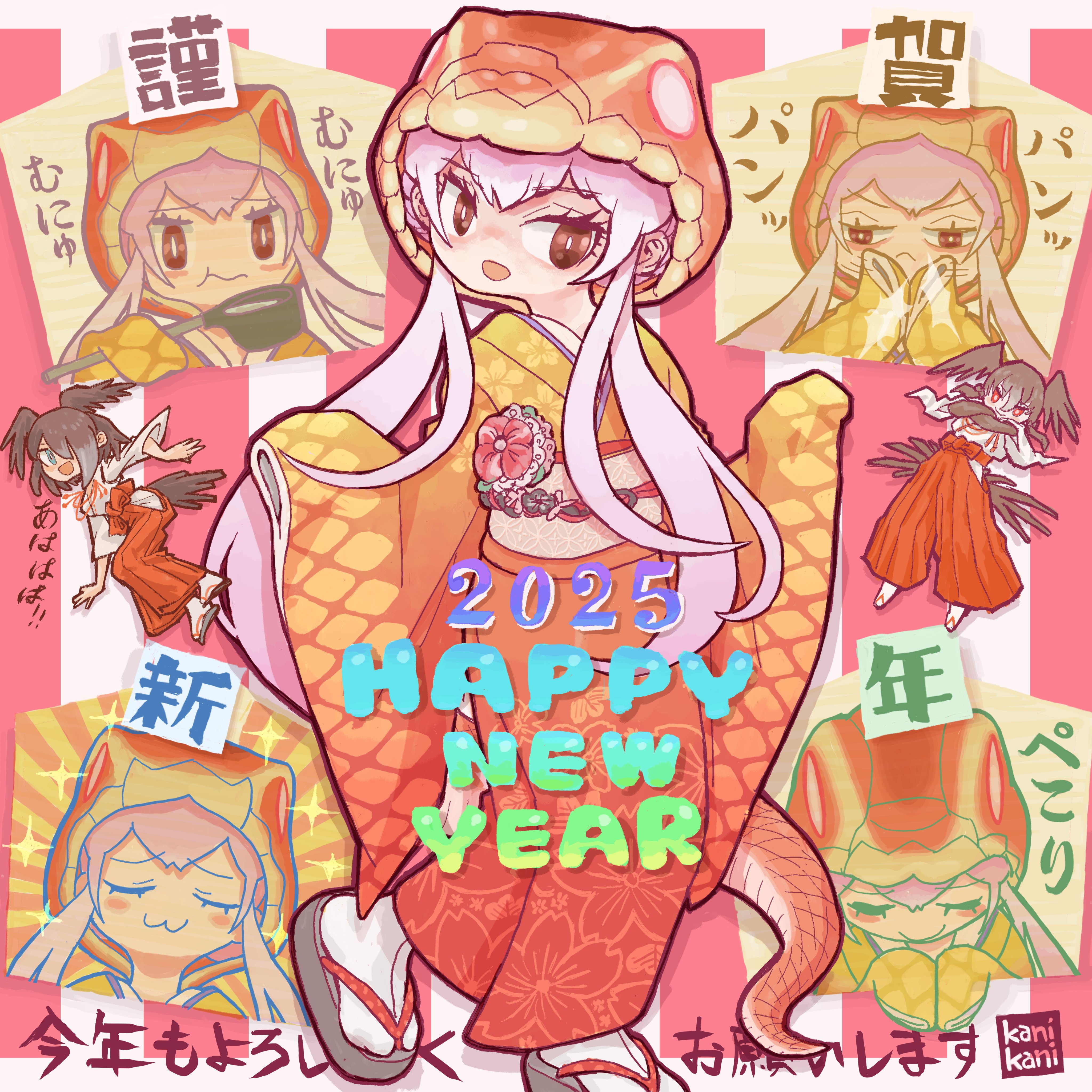 3girls absurdres bara_bara_(pop_pop) bird_girl bird_wings black_hair feathered_wings hakama happy_new_year head_wings highres hood japanese_clothes jungle_crow_(kemono_friends) kemono_friends kimono long_hair looking_at_viewer miko multiple_girls new_year pink_hair sandals slit_pupils snake_girl snake_tail tabi tail taipan_(kemono_friends) wings yatagarasu_(kemono_friends) zouri