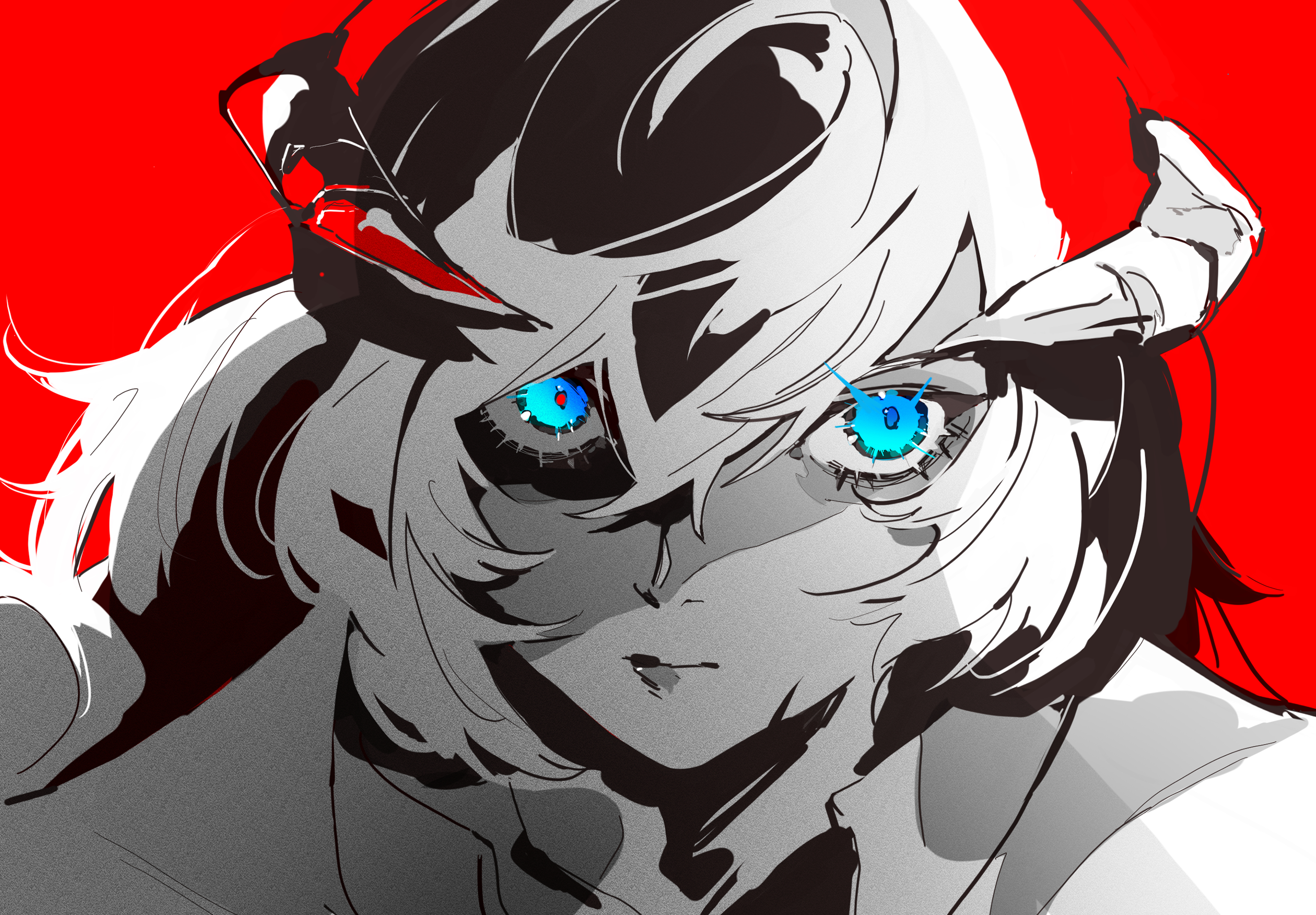 1boy blue_eyes close-up closed_mouth commentary_request eyelashes highres horns limited_palette long_hair louis_(metaphor:_refantazio) lower_eyelashes_only male_focus metaphor:_refantazio mina_(mina_st4r) red_background simple_background solo sparkling_eyes upper_body