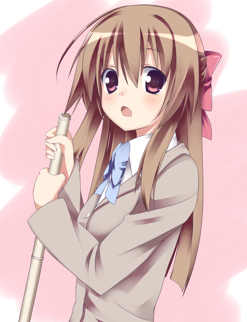 1girl :o blue_bow blue_bowtie bow bowtie brown_hair commentary_request grey_jacket hair_between_eyes hair_bow hisae_(hisae_collect) holding holding_mop jacket long_hair long_sleeves looking_at_viewer mop open_mouth original pink_background pink_bow pink_eyes school_uniform shirt sidelocks simple_background upper_body white_shirt