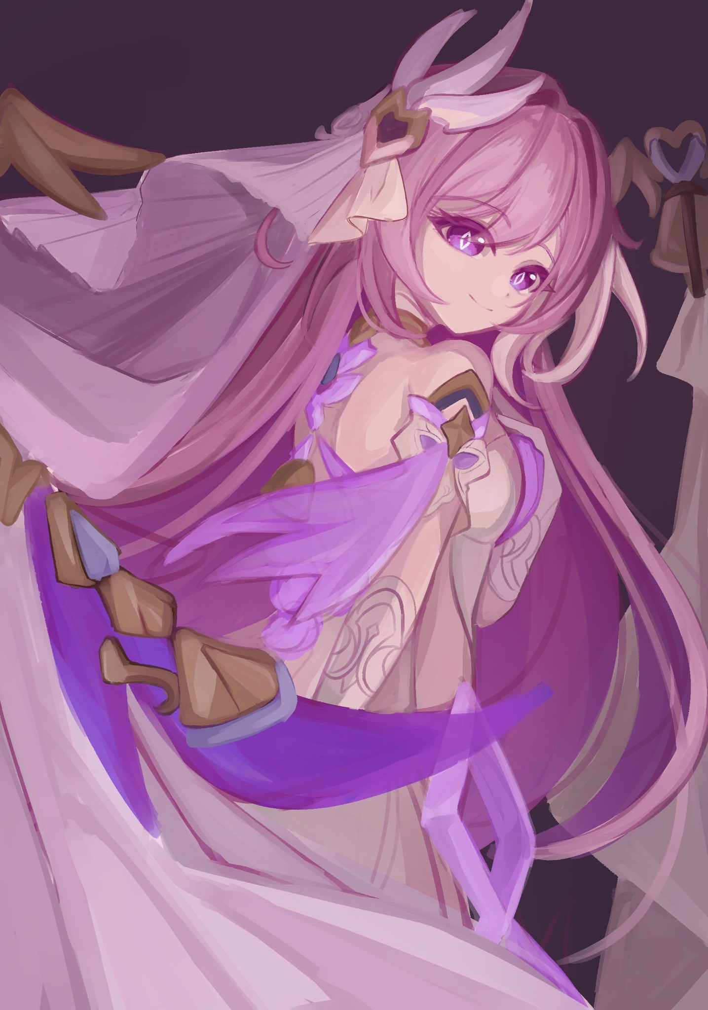1girl closed_mouth commentary diamond-shaped_pupils diamond_(shape) elysia_(herrscher_of_human:_ego)_(honkai_impact) elysia_(honkai_impact) from_behind highres honkai_(series) honkai_impact_3rd long_hair looking_at_viewer looking_back pink_hair purple_background purple_eyes q0s1s simple_background smile solo symbol-shaped_pupils veil very_long_hair white_veil