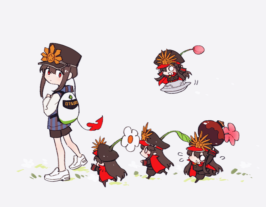 1boy 4girls :d arms_up backpack bag black_footwear black_hat black_jacket black_pants black_shorts blank_eyes bud buttons cape center-flap_bangs closed_mouth double-breasted fate/grand_order fate_(series) fiery_hair flower flying_sweatdrops grass hair_between_eyes hat holding_strap jacket jodhpurs keikenchi_(style) kepi koha-ace leaf letterman_jacket long_hair long_sleeves looking_at_another looking_back low_ponytail military_hat military_jacket military_uniform mini_nobu_(fate) motion_lines multiple_girls nintendo oda_nobukatsu_(fate) oda_nobukatsu_(tour_outfit)_(fate) oda_nobunaga_(fate) on_ground one_eye_covered open_mouth outstretched_arms pants peaked_cap pikmin_(creature) pikmin_(series) pink_flower ponytail red_cape running sempon_(doppio_note) shoes shorts sidelocks simple_background smile sneakers striped_clothes striped_jacket ufo vertical-striped_clothes vertical-striped_jacket walking white_background white_flower white_shoes