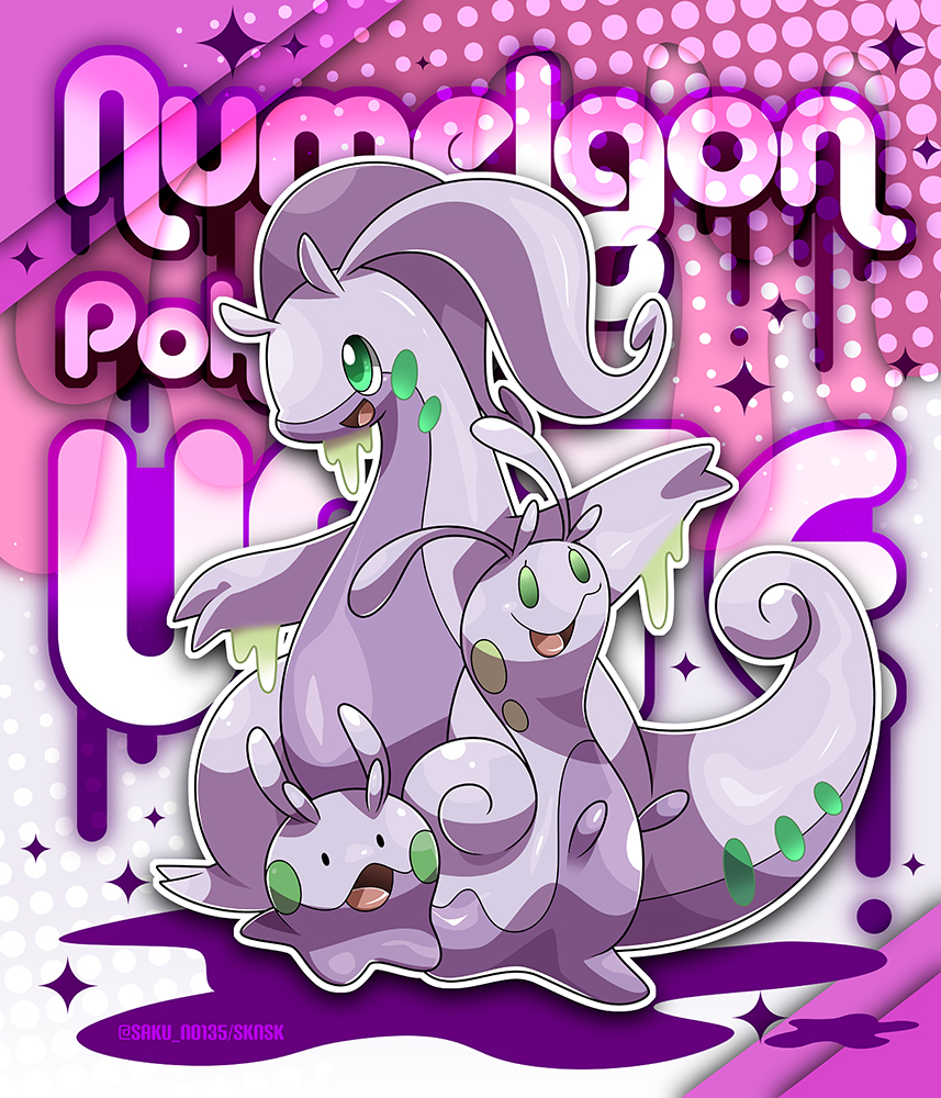 :d animal_focus character_name commentary_request dripping evolutionary_line gen_6_pokemon goodra goomy green_eyes kumano_sakunosuke nintendo no_humans open_mouth outline pokemon pokemon_(creature) pokemon_focus purple_theme sliggoo slime_(substance) smile twitter_username white_outline
