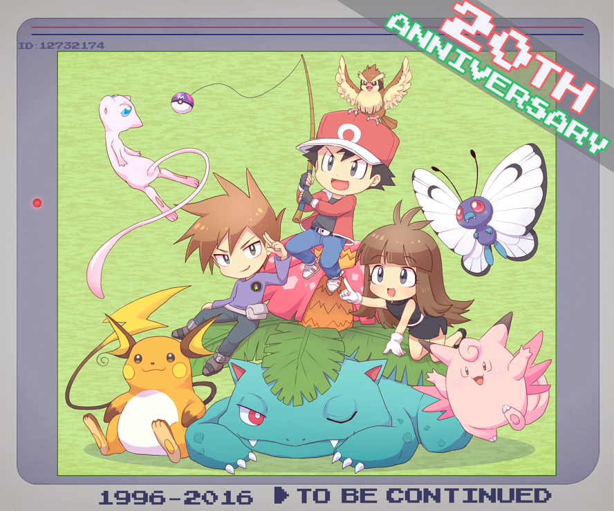 1girl 2boys anniversary black_dress black_hair blue_oak blue_pants bright_pupils brown_hair butterfree chibi chibi_only clefairy dress fishing_rod game_boy game_boy_(original) gen_1_pokemon gloves green_(pokemon) handheld_game_console hat jacket legendary_pokemon master_ball mew_(pokemon) multiple_boys mythical_pokemon nanopai_kakumeikokonoyu nintendo one_eye_closed pants pidgey poke_ball pokemon pokemon_(creature) pokemon_red/green/blue/yellow pokemon_red/green/blue/yellow_(prototype) purple_shirt raichu red_(pokemon) red_eyes red_hat red_jacket shirt shoes sneakers venusaur white_gloves white_pupils