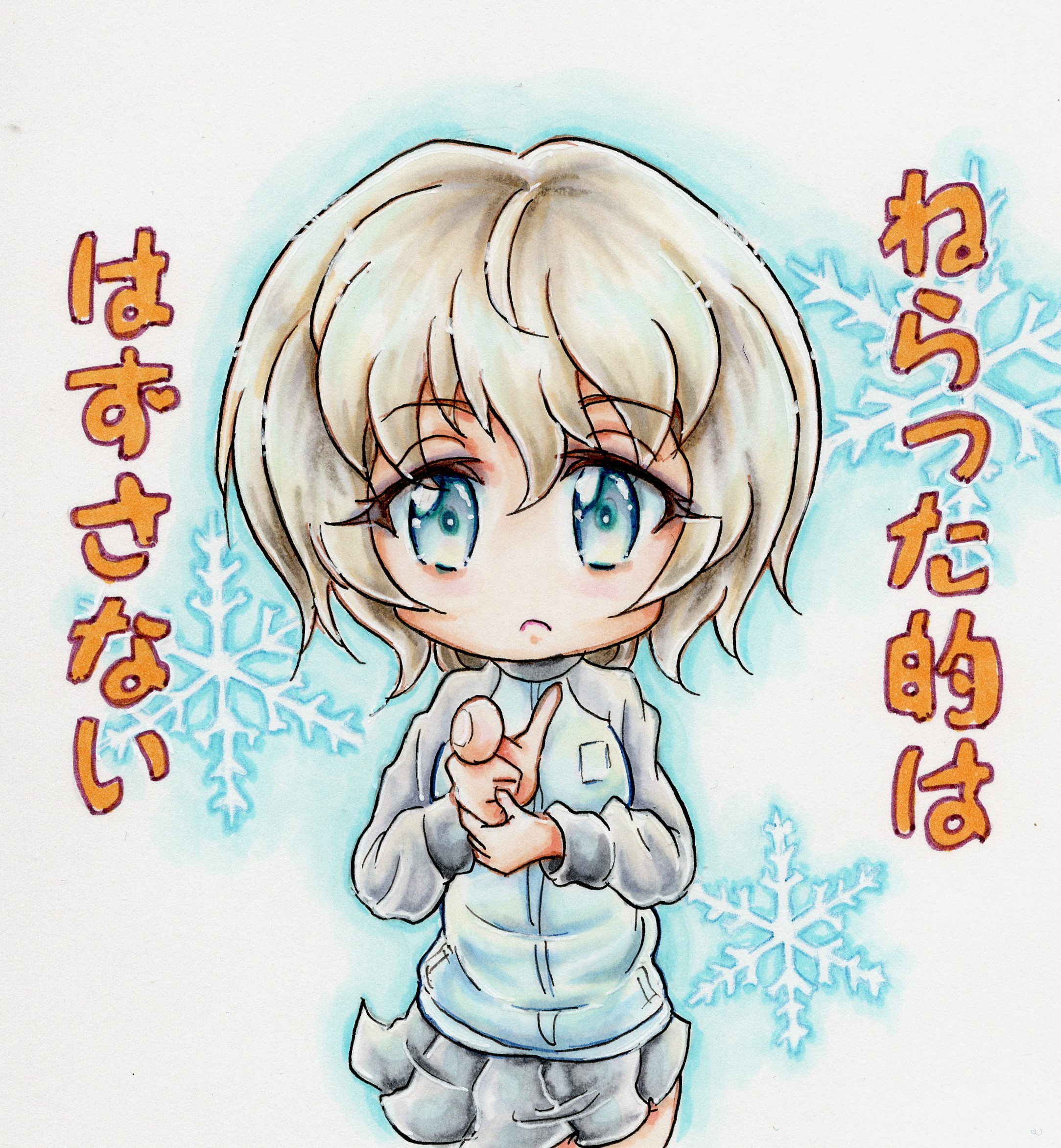 1girl adapted_costume blue_eyes blue_jacket chibi finger_gun girls_und_panzer grey_skirt highres jacket keizoku_military_uniform marker_(medium) miniskirt no_pants ntscd4cq2dgekz9 skirt snowflake_background snowflakes traditional_media translation_request white_hair youko_(girls_und_panzer)