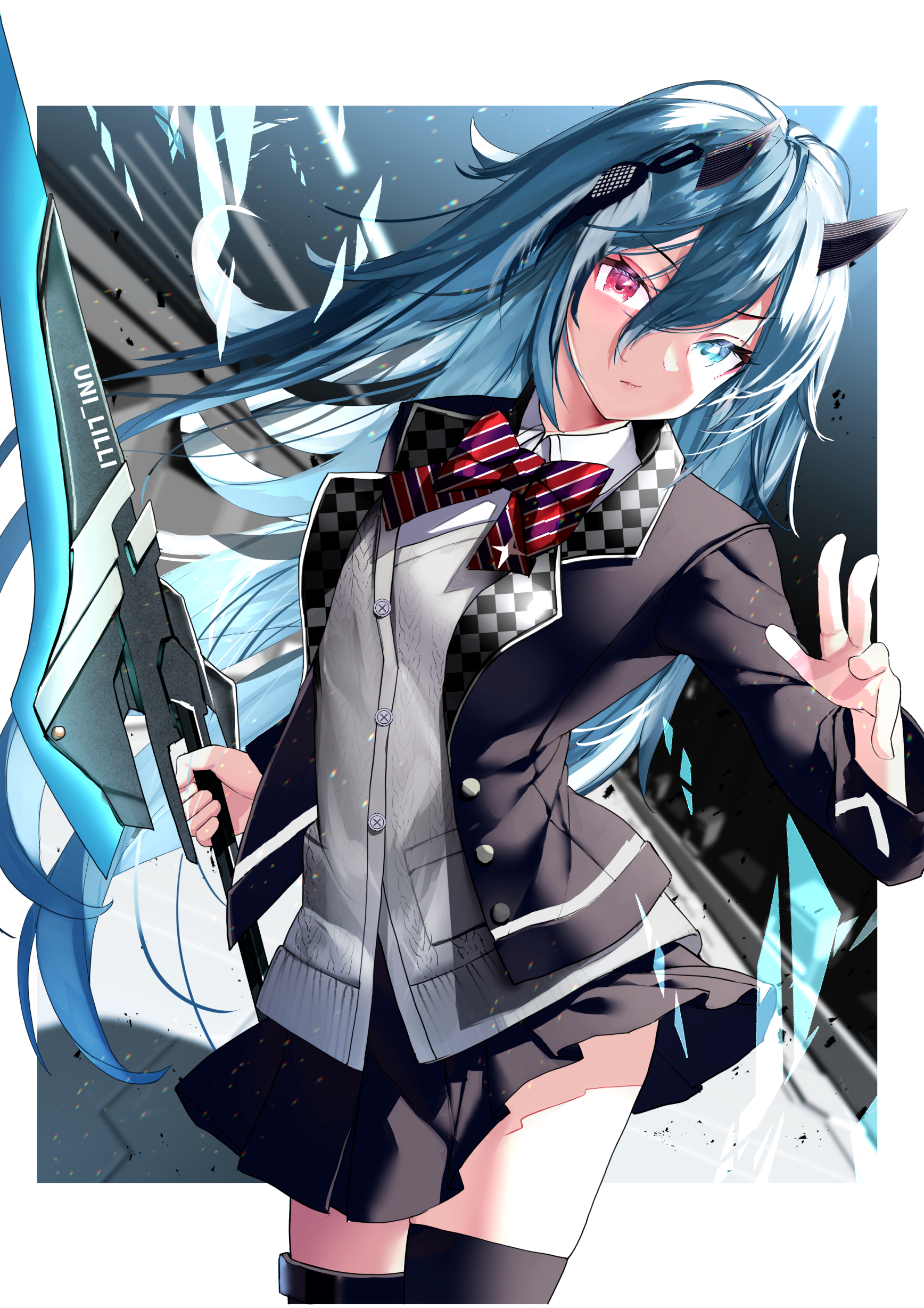 1girl absurdres antenna_hair aqua_eyes aqua_hair black_jacket black_skirt black_thighhighs bow bowtie cardigan closed_mouth collared_shirt commission grey_cardigan hair_ornament hand_up haruhina_purple heterochromia highres holding holding_weapon horns jacket long_hair looking_at_viewer miniskirt open_clothes open_jacket original phantasy_star phantasy_star_online_2 purple_eyes shirt skeb_commission skirt solo standing striped_bow thighhighs weapon white_shirt