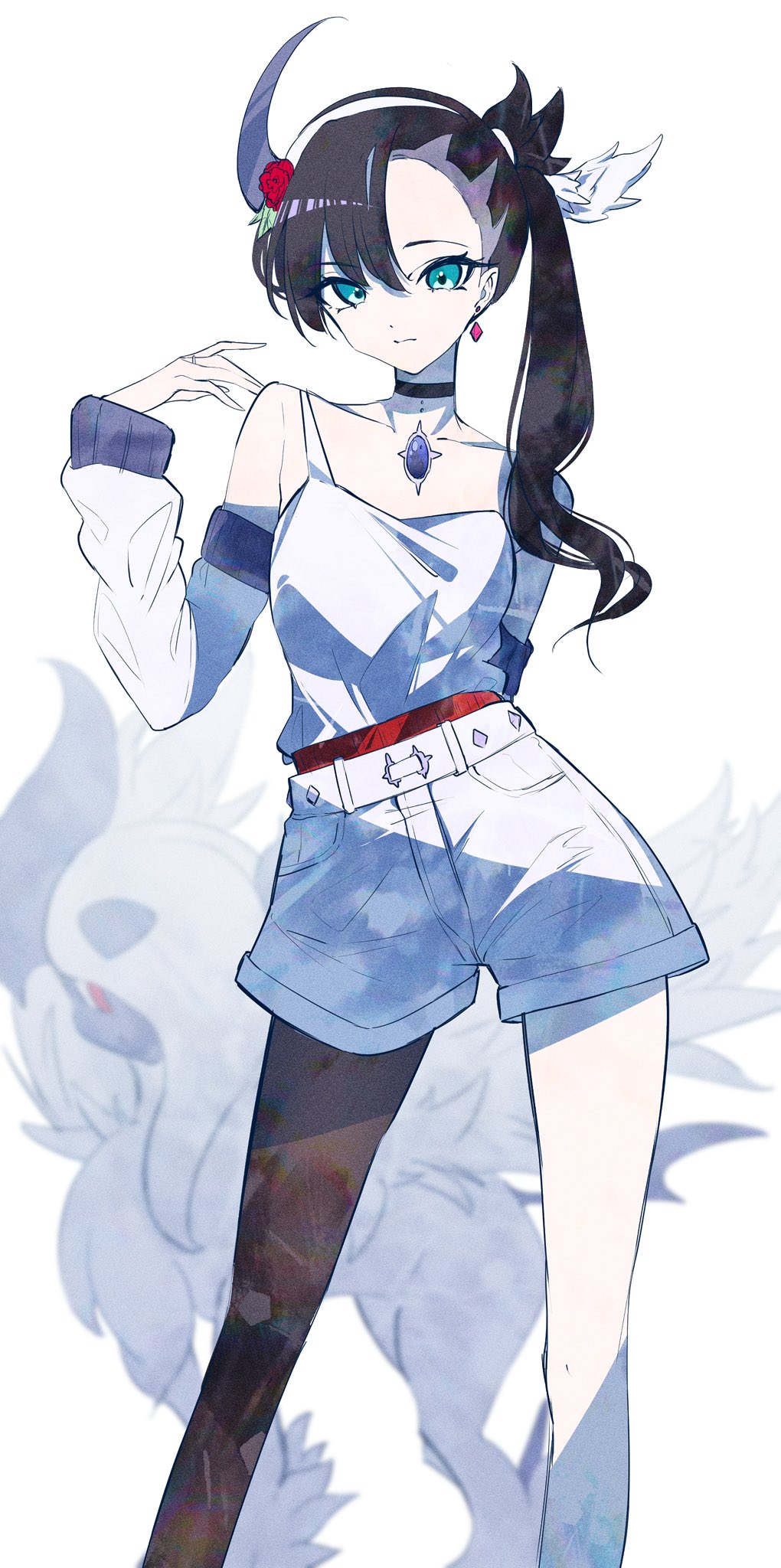 1girl absol animal_hairband asymmetrical_legwear belt black_hair black_pantyhose blue_gem collarbone flower gem gen_3_pokemon green_eyes hairband highres long_hair marie_(pixiv59672544) marnie_(pokemon) nintendo pantyhose pokemon pokemon_(creature) pokemon_sword_and_shield red_flower red_rose rose shirt shorts side_ponytail solo swept_bangs white_background white_belt white_shirt white_shorts