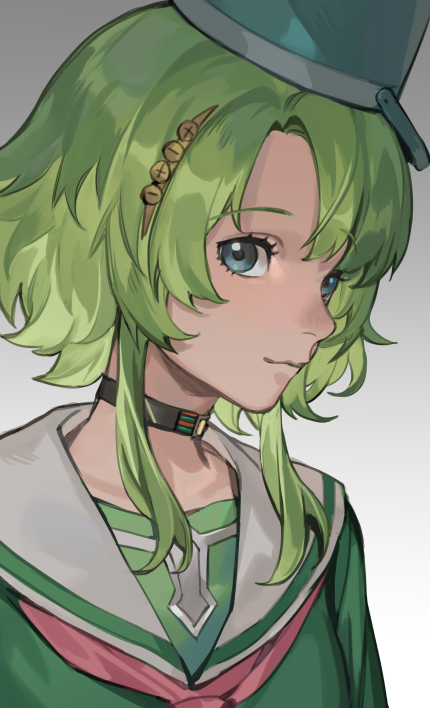 1girl bucket bucket_on_head choker closed_mouth commentary_request gradient_background green_hair green_serafuku grey_background kimi_ga_shine kizuchi_kanna looking_at_viewer object_on_head portrait sailor_collar school_uniform serafuku sidelocks solo zoo_(oukakumaku)