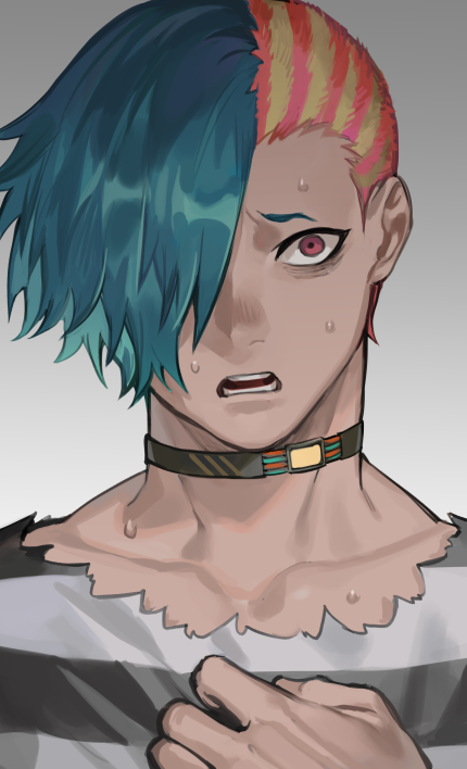1boy choker collarbone gradient_background grey_background grimace hair_over_one_eye kimi_ga_shine looking_at_viewer male_focus nervous_sweating open_mouth pink_eyes prison_clothes shirt solo striped_clothes striped_hair striped_shirt sweat teeth torn_clothes torn_shirt yabusame_alice zoo_(oukakumaku)