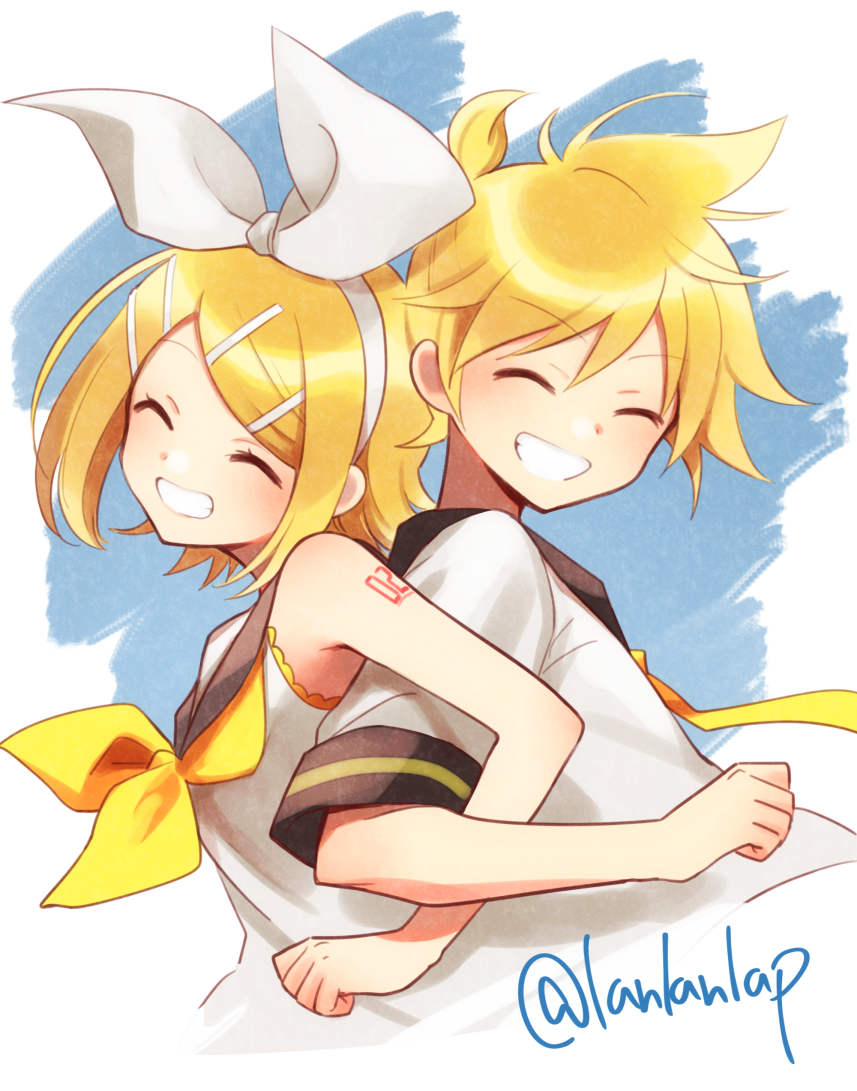 1boy 1girl ^_^ arm_tattoo blonde_hair bow brother_and_sister closed_eyes grin hair_bow hair_ornament hairband hairclip kagamine_len kagamine_rin lanlanlap locked_arms neckerchief necktie parallel_hairclips parted_bangs shirt short_hair short_sleeves siblings sleeveless sleeveless_shirt smile tattoo twitter_username vocaloid white_bow white_hairband white_shirt yellow_neckerchief yellow_necktie