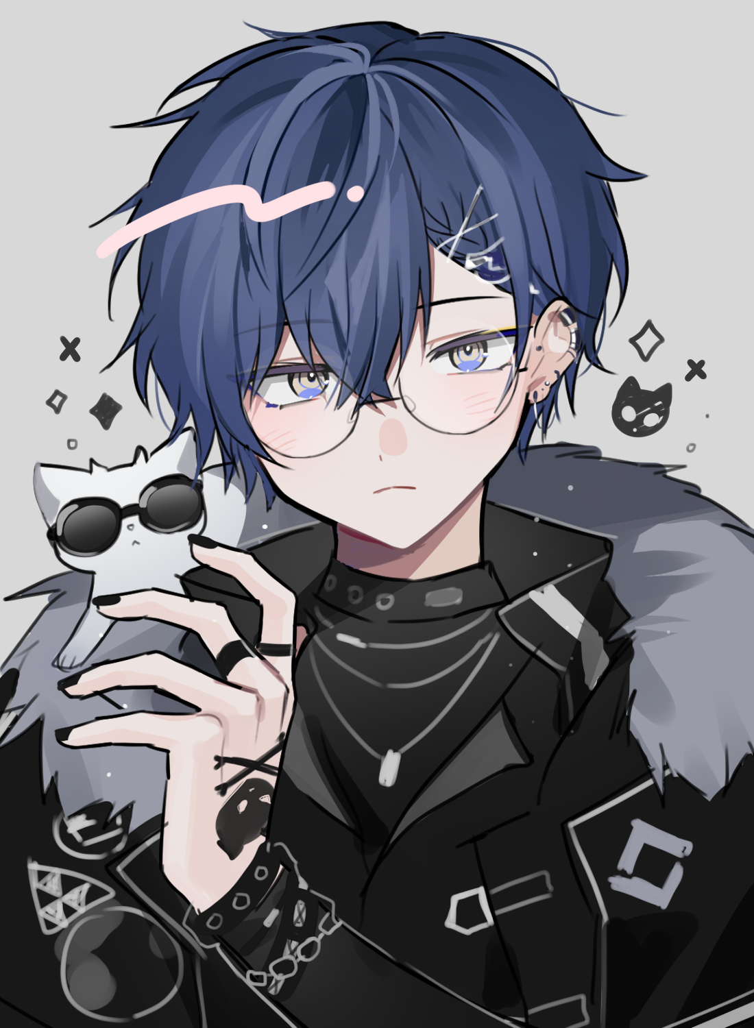 1boy animal animal_on_shoulder bespectacled black_jacket black_shirt blue_eyes blue_hair bracelet cat commentary_request frown fur-trimmed_jacket fur_trim glasses grey_background hair_ornament highres jacket jewelry koyanagi_rou koyanagi_rou_(2nd_costume) looking_at_viewer male_focus multicolored_eyes multiple_bracelets nijisanji shirt short_hair simple_background sparkle sunglasses two-tone_eyes upper_body virtual_youtuber waka_(wk4444) x_hair_ornament yellow_eyes
