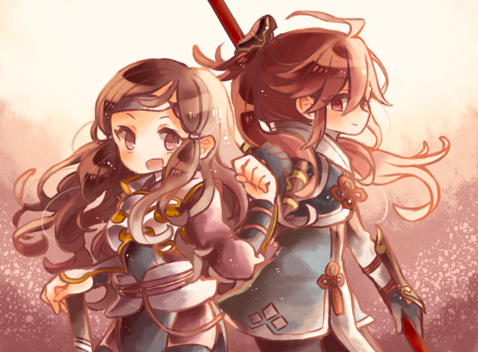 1boy 1girl ahoge armor brown_hair fire_emblem fire_emblem_fates hana_(fire_emblem) headband japanese_armor japanese_clothes nintendo ponytail red_hair samurai subaki_(fire_emblem) toskogahazan