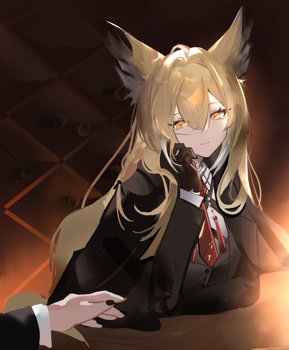 2girls ahoge animal_ears arknights arm_rest black_coat black_gloves black_nails black_vest braid buttons closed_mouth coat coat_on_shoulders commentary_request female_pov fingernails fox_ears fox_girl gloves hair_between_eyes hair_intakes head_rest highres indoors korean_commentary light_smile long_hair long_sleeves looking_at_viewer multiple_girls nail_polish necktie official_style orange_eyes penance_(arknights) pov pov_hands red_necktie ricefox_(nonametofu) scar scar_on_face side_braid sitting table tassel vest vulpisfoglia_(arknights) waistcoat