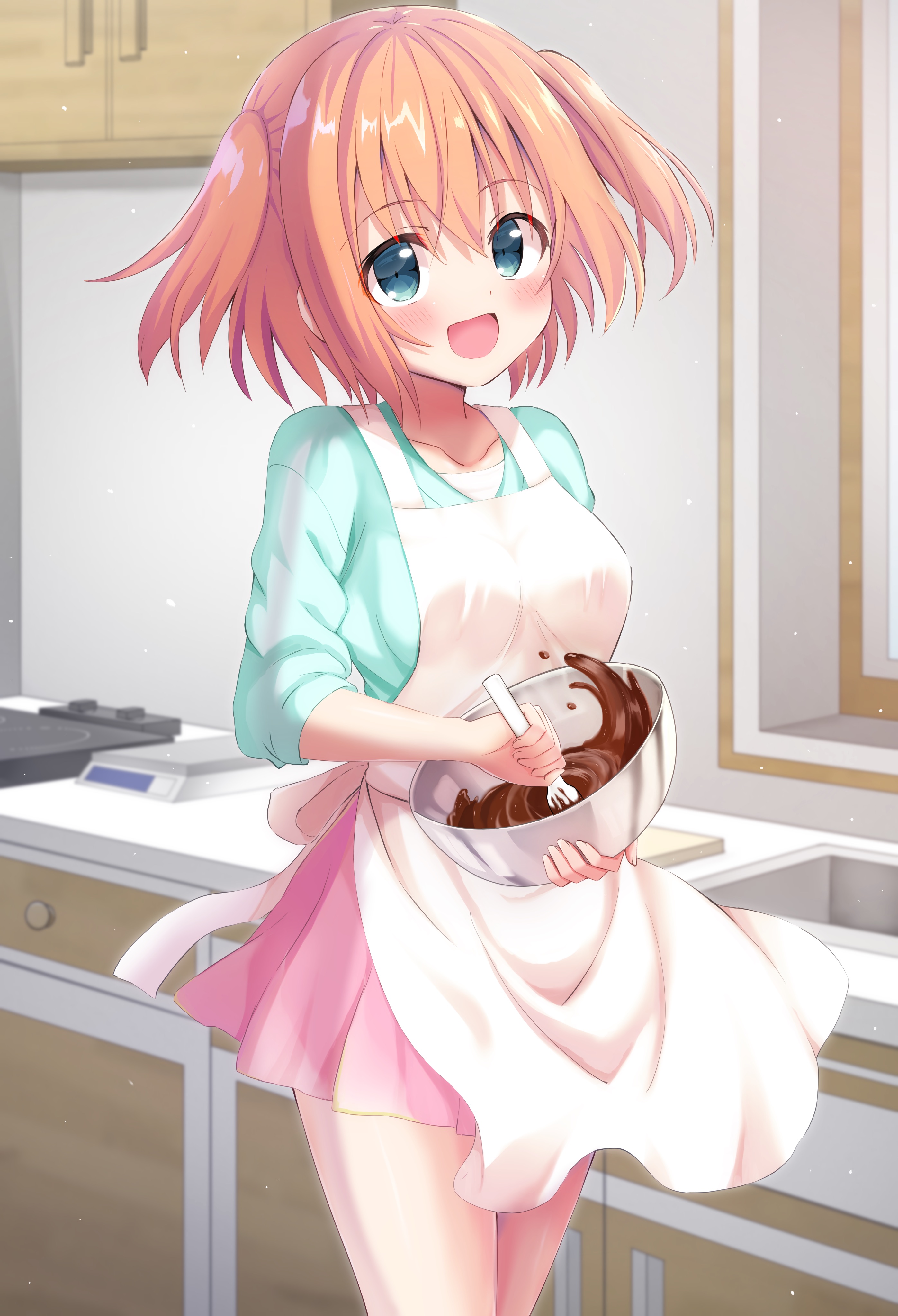 1girl absurdres apron aqua_eyes blush bowl chocolate chocolate_making commentary_request green_shirt highres hinamori_shiyaka_(yozakura_souki) holding holding_bowl indoors looking_at_viewer miniskirt mixing mixing_bowl open_mouth orange_hair original pink_skirt shirt short_hair skirt smile solo standing two_side_up valentine whisk white_apron yozakura_souki