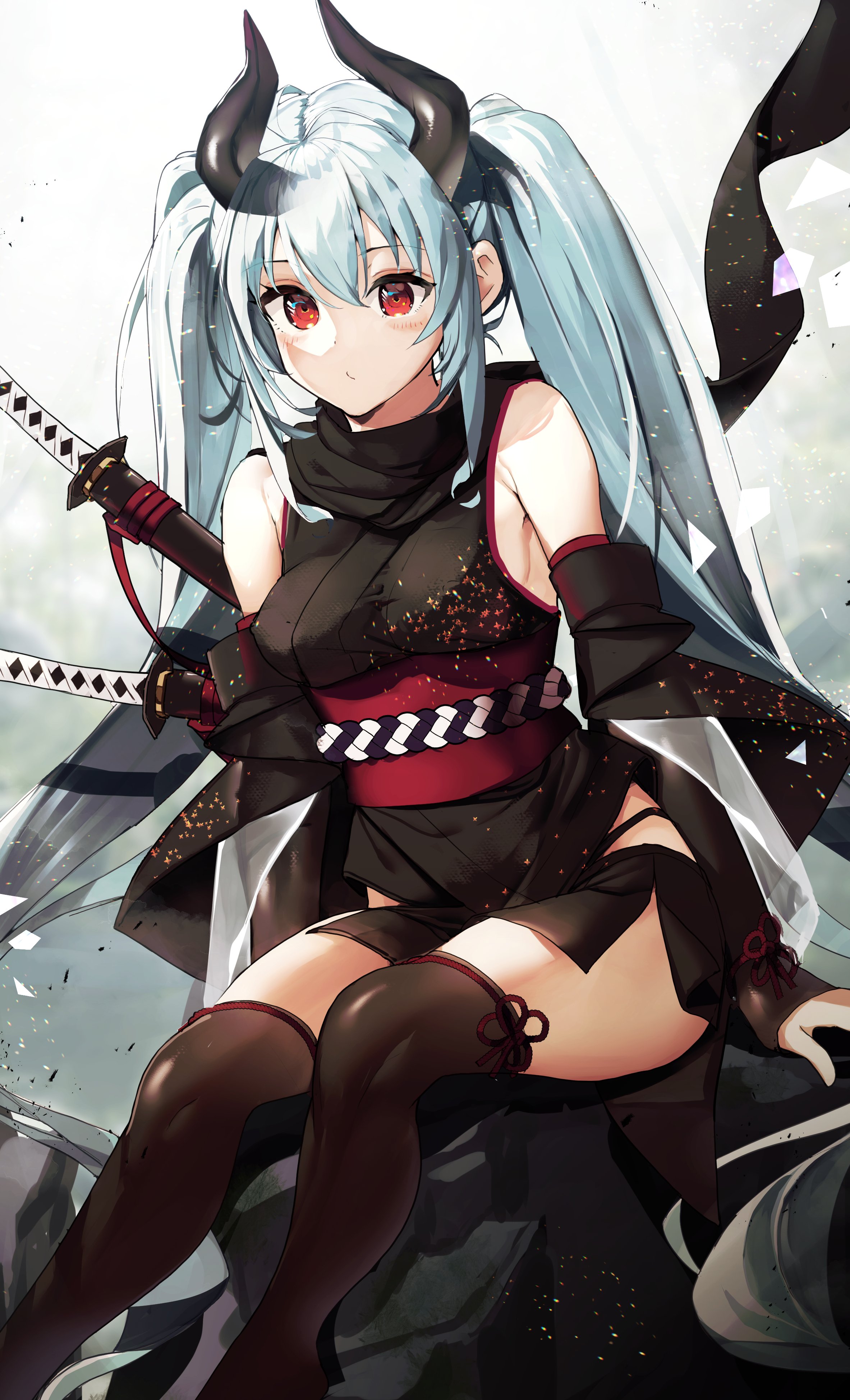 1girl absurdres ahoge aqua_hair bare_shoulders black_kimono black_scarf black_thighhighs blush breasts closed_mouth commentary_request commission detached_sleeves haruhina_purple highres horns japanese_clothes katana kimono long_hair looking_at_viewer medium_breasts obi on_rock original outdoors red_eyes sash scarf sheath sheathed sitting skeb_commission sleeveless sleeveless_kimono sleeves_past_wrists solo sword thighhighs twintails very_long_hair weapon