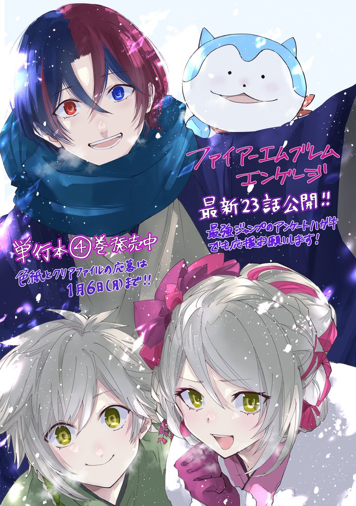 1girl 1other 2boys male_alear_(fire_emblem) blonde_hair blue_hair brother_and_sister clanne_(fire_emblem) crossed_bangs fire_emblem fire_emblem_engage framme_(fire_emblem) heterochromia konnichi_warou multicolored_hair multiple_boys nintendo open_mouth pink_hair red_hair siblings sommie_(fire_emblem) split-color_hair translation_request twins two-tone_hair winter yellow_eyes
