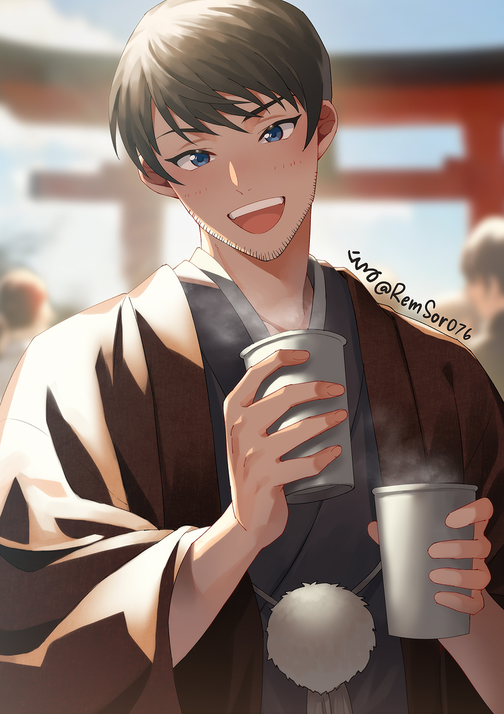 1boy black_hair blue_eyes blue_kimono blurry blurry_background brown_haori crowd cup disposable_coffee_cup disposable_cup facial_hair haori haori_himo highres holding holding_cup japanese_clothes kimono looking_at_viewer male_focus meitantei_conan open_mouth raru_(remsor076) scotch_(meitantei_conan) solo steam teeth torii upper_teeth_only