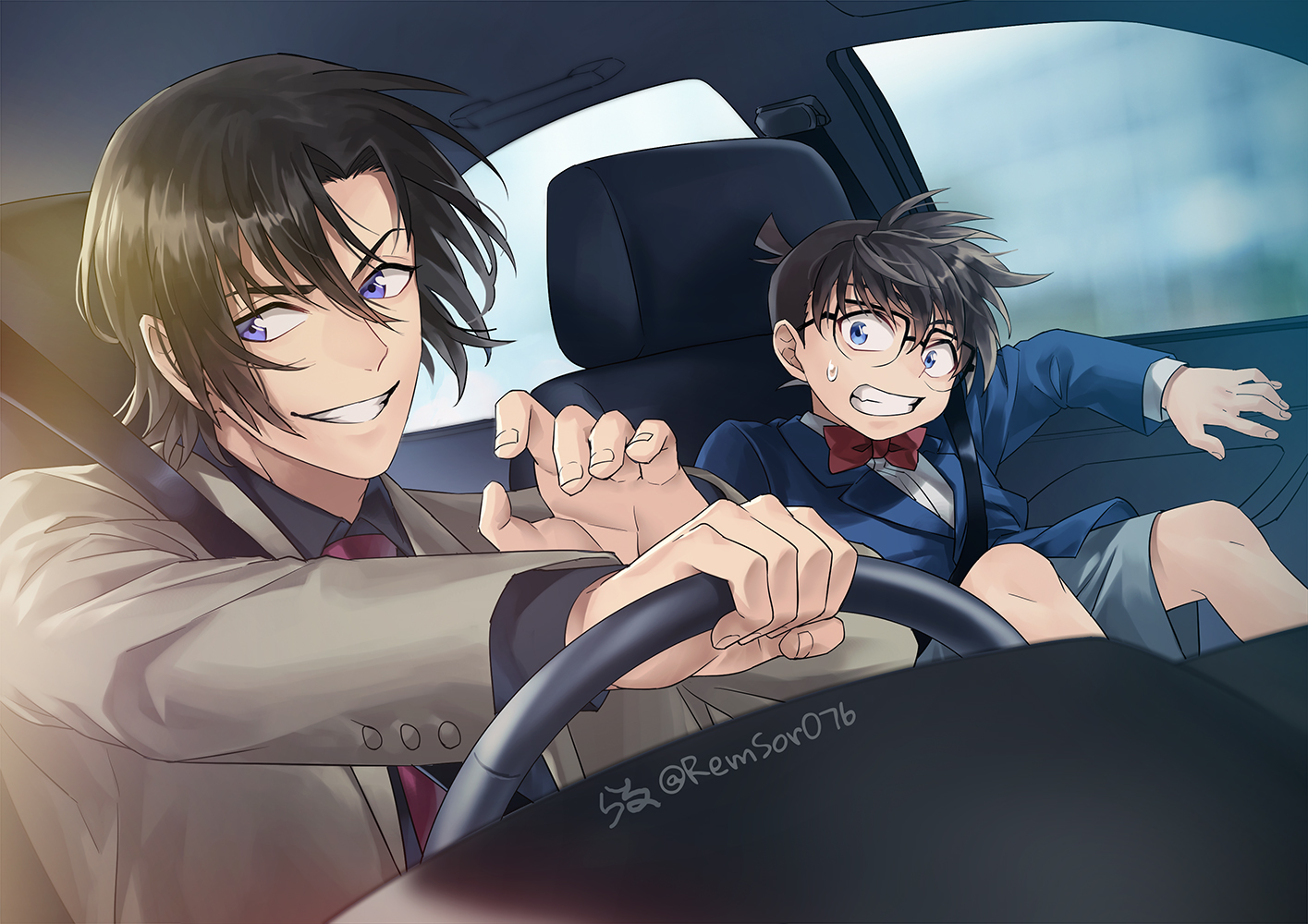 2boys black_hair black_shirt blue_eyes blue_jacket bow bowtie brown_hair clenched_teeth commentary_request driving edogawa_conan glasses hagiwara_kenji hair_between_eyes jacket looking_to_the_side male_focus meitantei_conan multiple_boys necktie raru_(remsor076) red_bow red_bowtie red_necktie shirt short_hair smile teeth twitter_username