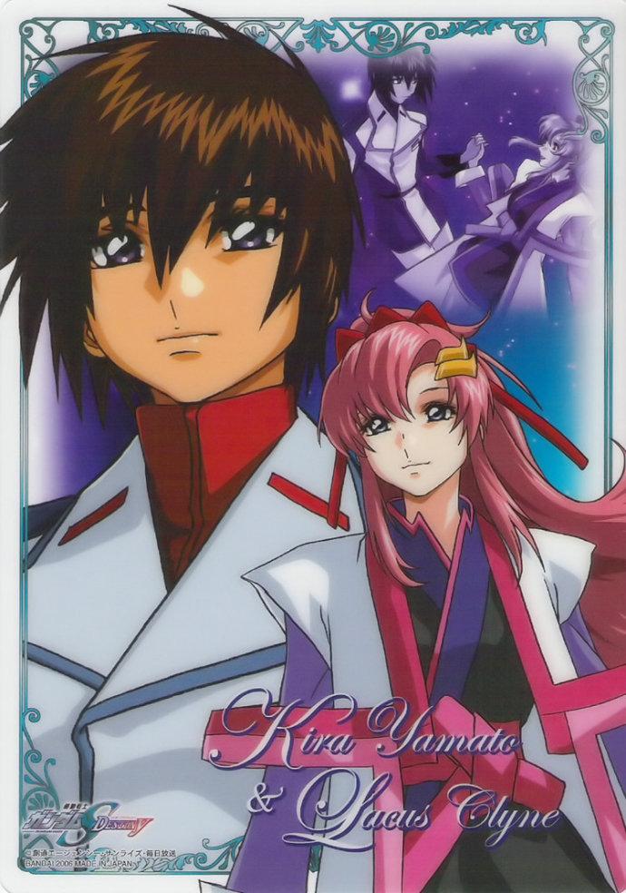 1boy 1girl brown_hair gundam gundam_seed gundam_seed_destiny hirai_hisashi holding_hands kira_yamato lacus_clyne pink_hair purple_eyes