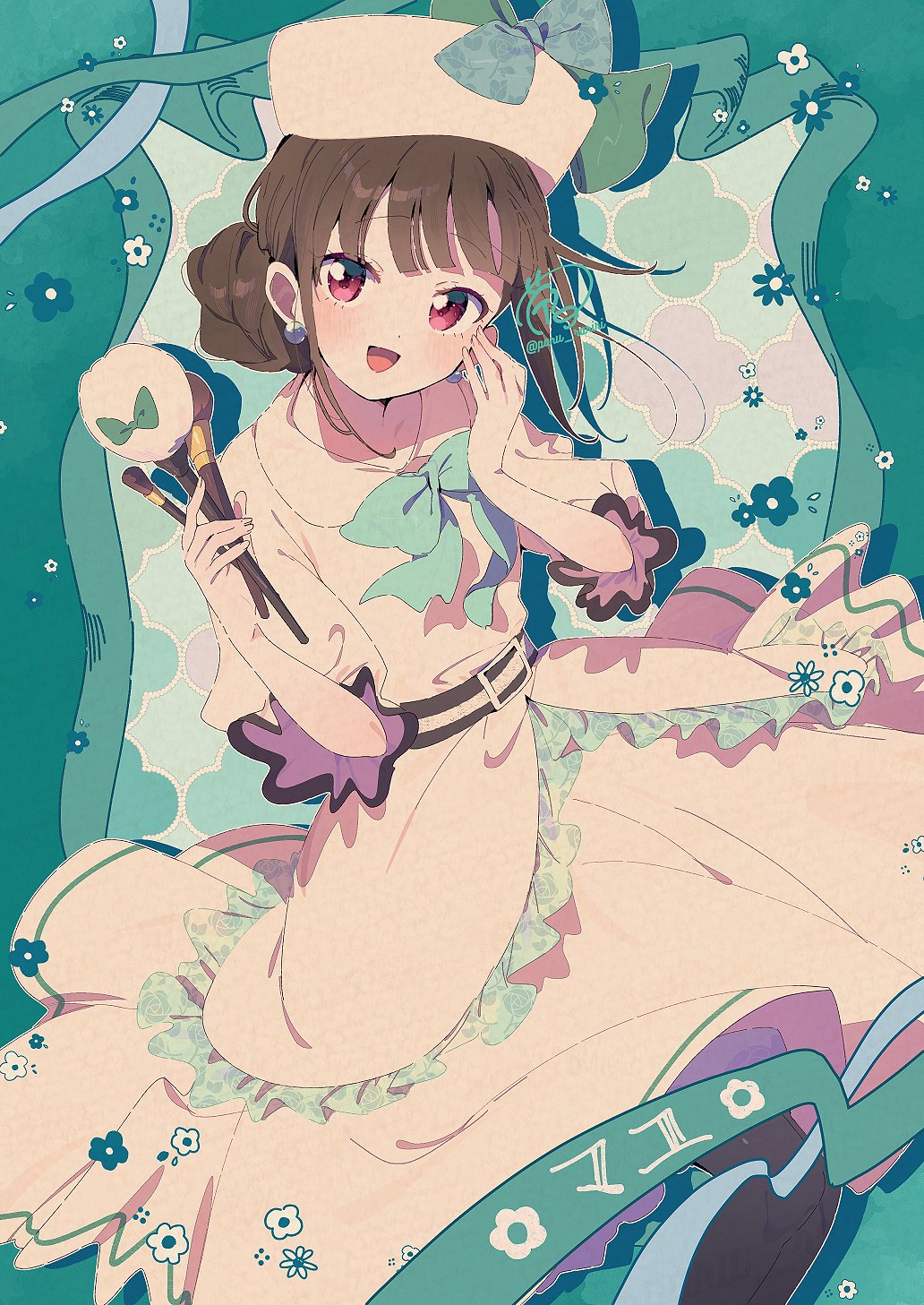 1girl adapted_costume alternate_costume aqua_background aqua_bow aqua_flower aqua_ribbon belt belt_buckle black_belt black_hair blue_bow blue_bowtie blunt_bangs bow bowtie buckle character_name collared_dress commentary dot_nose dress earrings eyelashes feet_out_of_frame flower frilled_dress frilled_sleeves frills fur_hat hair_bun hand_on_own_cheek hand_on_own_face happy hat hat_bow highres holding holding_brush holding_makeup_brush jewelry light_blush long_sleeves makeup_brush medium_dress nekoyashiki_mayu open_mouth outline outside_border pink_eyes pleated_dress powder_puff precure puffy_long_sleeves puffy_sleeves ribbon serizawa_serizane shadow short_hair_with_long_locks signature single_hair_bun single_stripe smile solo sphere_earrings striped_belt untranslatable_commentary three-quarter_sleeves twitter_username ushanka white_dress white_flower white_hat white_outline wonderful_precure!