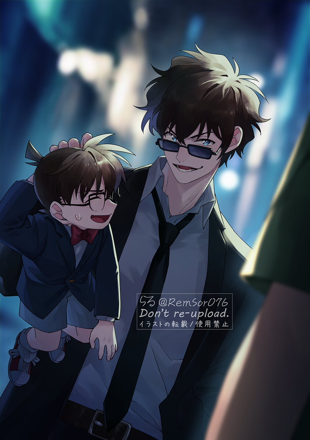 2boys black_suit blue_eyes blue_jacket blurry blurry_background bow bowtie brown_hair collared_shirt commentary_request edogawa_conan formal_clothes glasses hair_between_eyes highres holding jacket male_focus matsuda_jinpei meitantei_conan multiple_boys raru_(remsor076) red_bow red_bowtie shirt short_hair smile suit sunglasses sweatdrop twitter_username white_shirt