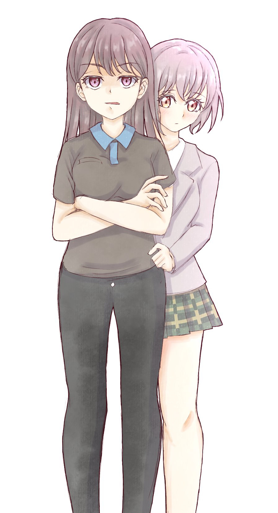 bang_dream! bang_dream!_it's_mygo!!!!! black_pants black_shirt breasts brown_eyes brown_hair commentary crossed_arms english_commentary green_skirt grey_hair grey_jacket haneoka_school_uniform hiding hiding_behind_another highres jacket long_hair medium_breasts miikoko no_mole open_mouth pants plaid_clothes plaid_skirt pleated_skirt purple_eyes school_uniform shiina_taki shirt short_hair simple_background skirt standing takamatsu_tomori white_background